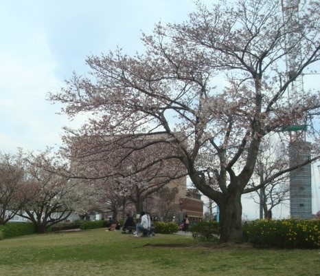 桜目的でみなとみらいに行き、汽車道の先にある運河パークに寄りました。芝生の広場に桜の木が数本あり、白っぽい桜の木もありました。