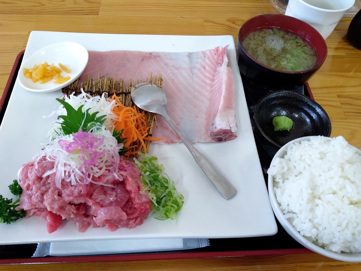 みなと市場の中にある鮪専門店。ここで食事ができるが、メニューはとにかく「鮪づくし」で鮪好きにはたまらない世界だ。私は限定メニューの「中落ち定食」をオーダー。しばし待つと配膳されるが、ご飯と同じくらいの量の鮪中落ち!そして中トロ、大トロがあったところの皮がドーンと!。こちらはスプーンでそぎながら食べる!これまた絶品!。今回はご飯のオカワリは我慢したけれど、胃袋解放したら4~5杯は軽く食べられるくらいの鮪の量に大満足だった。