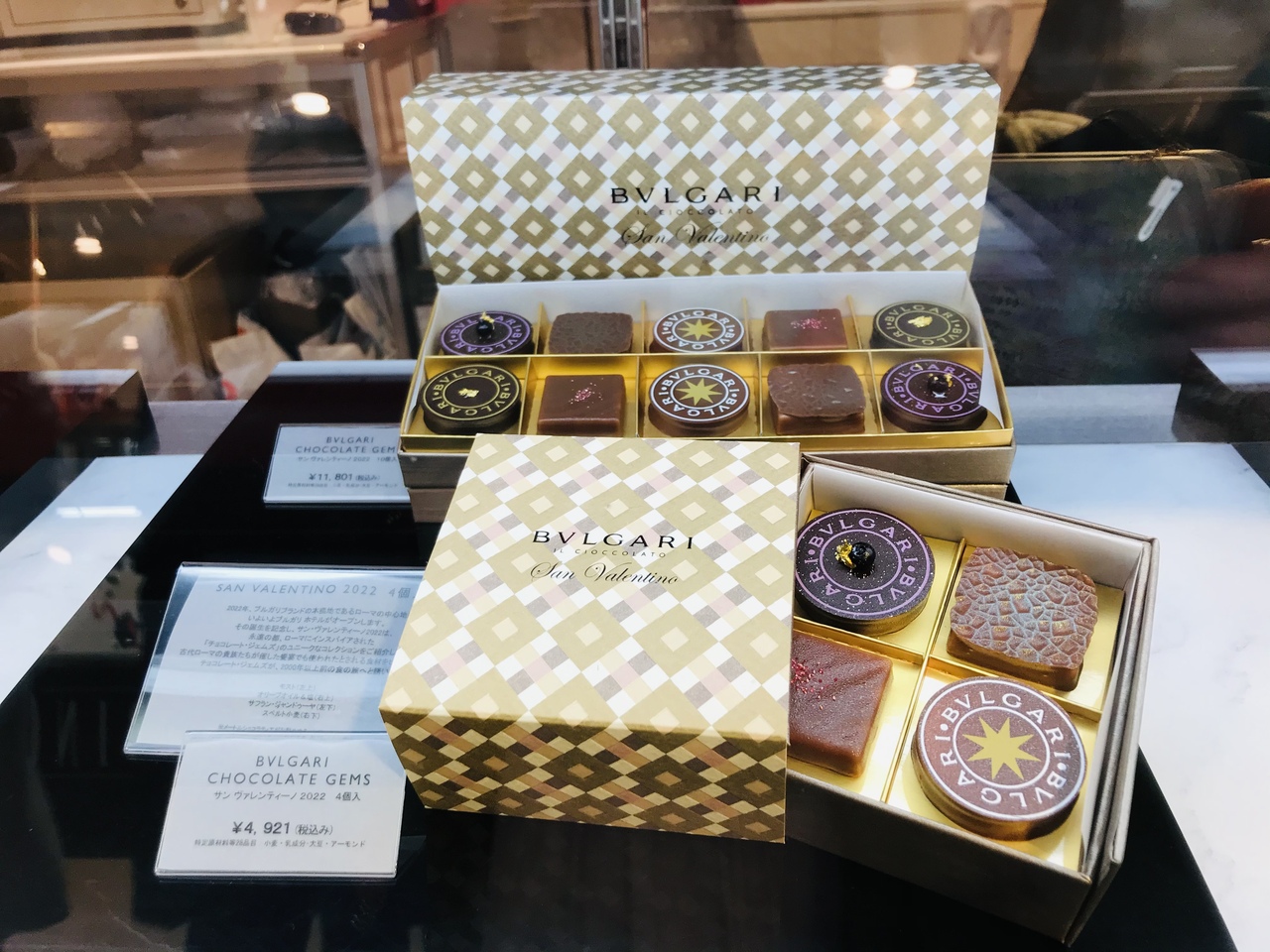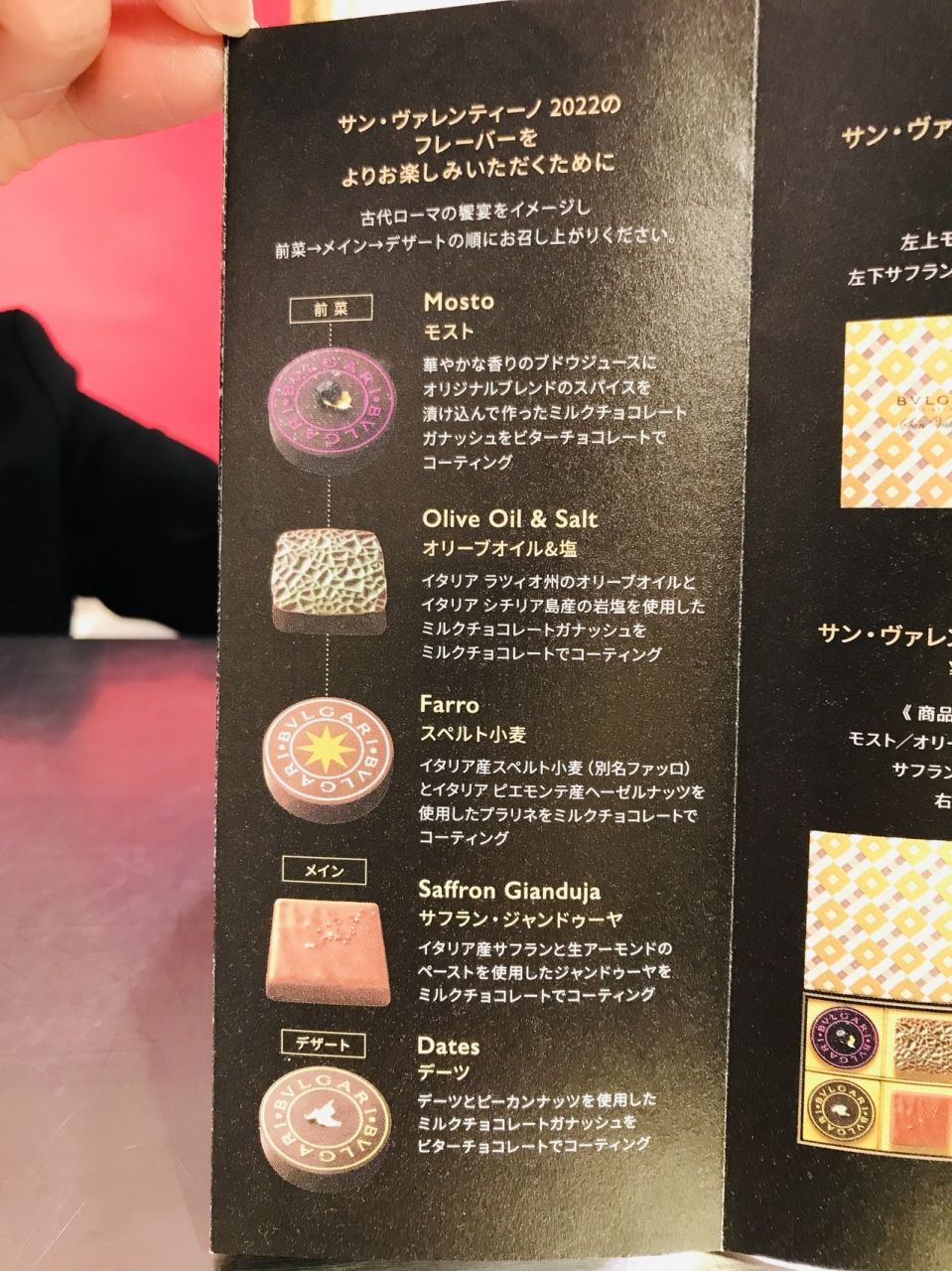 今回はブルガリのバレンタイン限定、コース料理をイメージしたという4個入り(4920円)を購入しました。