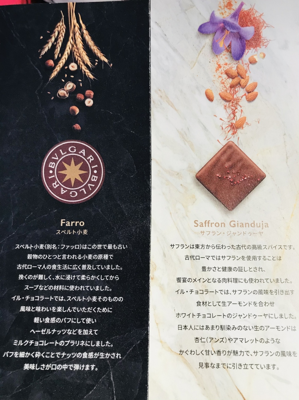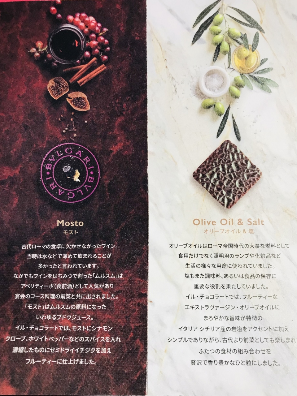 ブドウやオリーブオイル&塩、スペルト小麦やサフランなど、チョコレートに合うんだ!?という原料を使っているのがおもしろかったです。