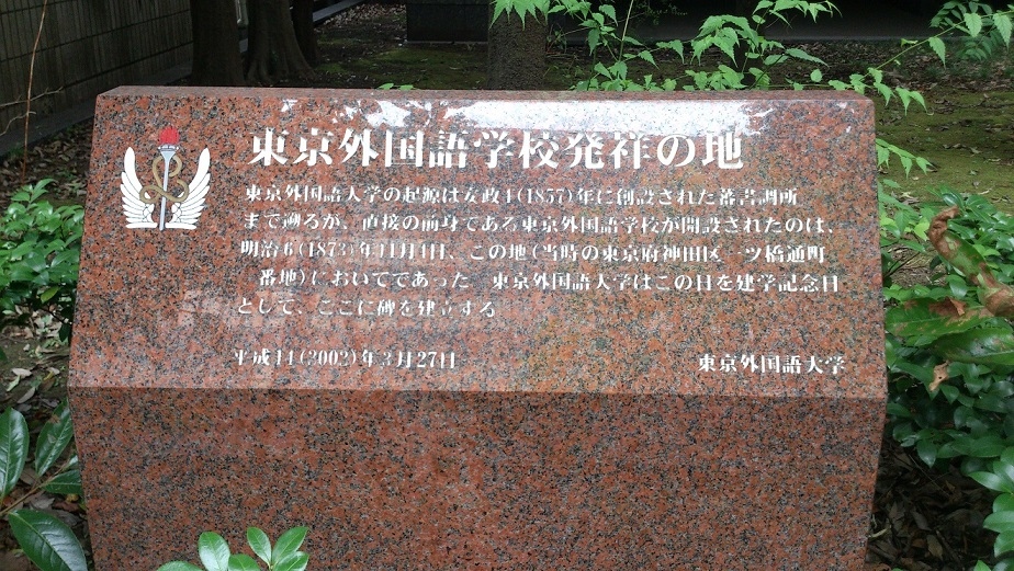 千代田区一ツ橋1丁目の如水会館のそばに立っています。明治6年、この地に東京外国語大学の前身、東京外国語学校が設立されました。昭和15年に北区西ヶ原に移転するまでこの地にキャンパスがあったそうです。東京大学発祥の地碑も近くにありますので、大学発祥碑に興味のある方は併せてお立ち寄りを おすすめします。