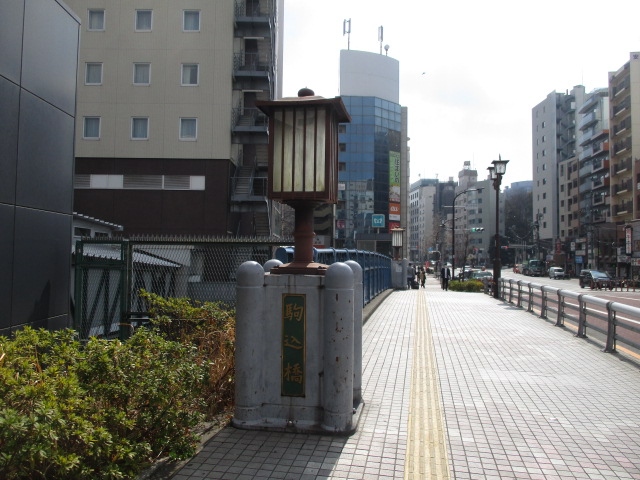 JR駒込駅北口を出て横断歩道を渡って六義園方面に向う途中に駒込橋がありました。山手線に架かっている橋で山手線、湘南新宿ラインの車両を眺めることができ気持ち良かったです。親柱は江戸風灯籠、欄干は富士山と桜の意匠デザインが施されていて見ごたえあります。