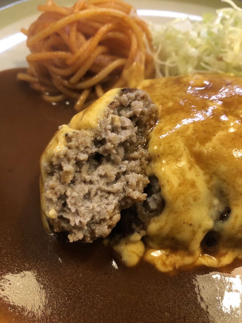 ハンバーグはプンプクリンに膨らんで、そこにとろーりチーズ