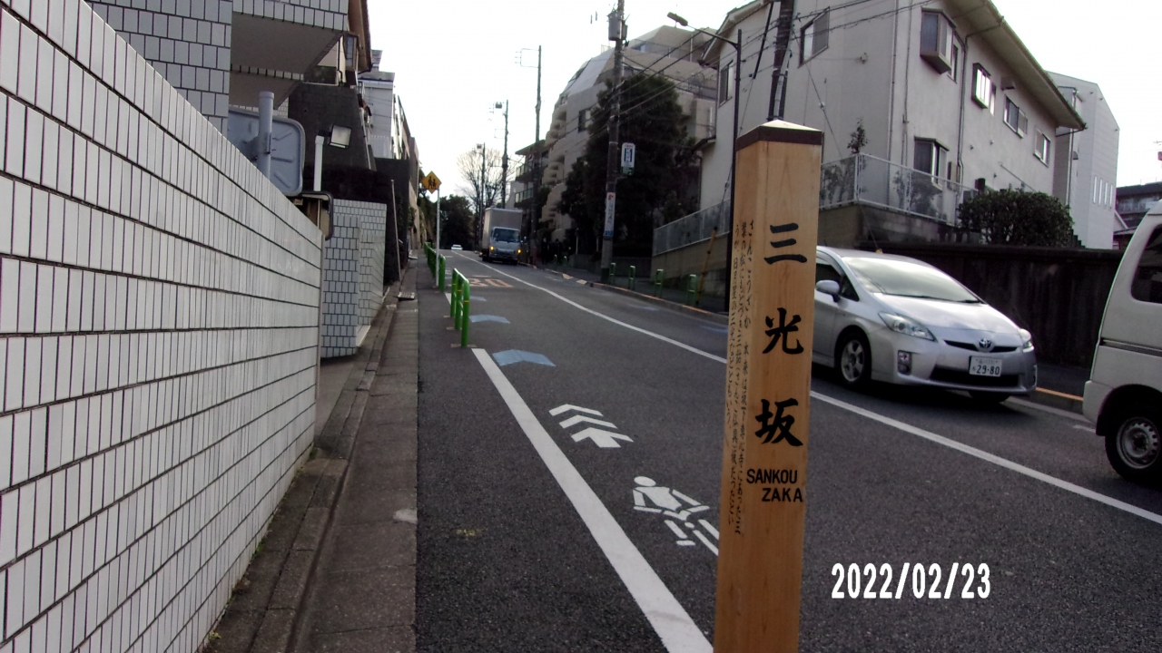 この三光坂は北里大学がある通りから南に上る坂です。坂下には両脇に西光寺と専心寺があります。地下鉄都営三田線と東京メトロ南北線の白金高輪駅から西に10分程度の場所にあります。この坂の由来は柱碑に記されたいます。日と月と星が見られるという坂からと思いたいです。