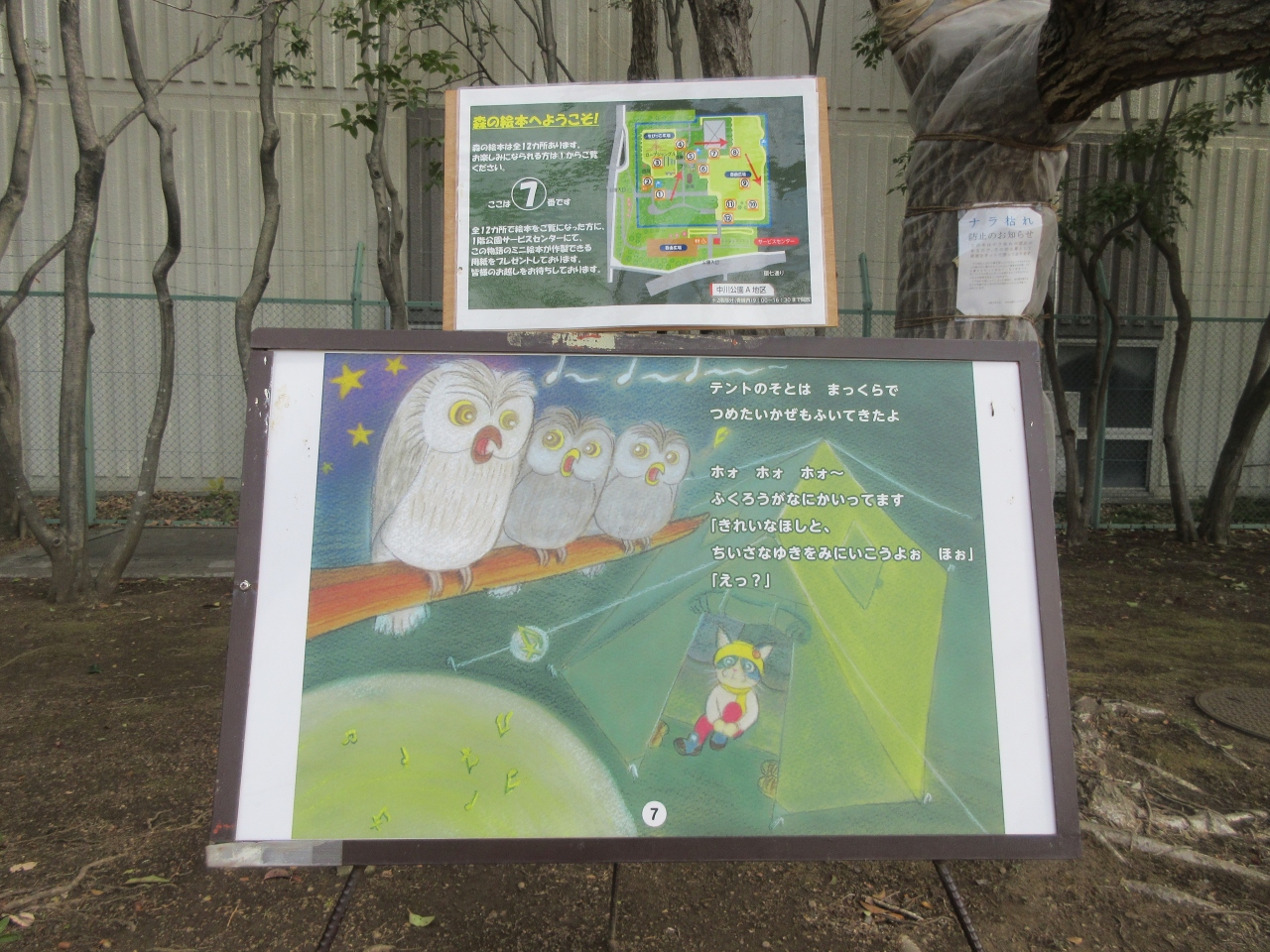 大谷田公園から環七を東へ歩いて中川公園に行きました。環七沿いの自由広場でグランドゴルフをやっていました。環七の大谷田橋交差点そばの北門からA地区の中川水再生センター屋上部分に入りました。ここは9時~16時半に開放されます。北門を入った近くのちびっこ広場で園児がボールを使った運動をしていました。ロープジャングルや鉄棒がありました。広い草地の自由広場で犬を遊ばせている人たちやボールを蹴っている人がいました。訪れた平日午前10時過ぎは、人が少なくてゆったりした感じでした。A地区で行われている森の絵本展示イベントを見ました。園内を歩きながら未発表の絵本を読んでいき、西門のサービスセンターでミニ絵本作成用紙をもらいました。少しセンターの臭いがしますが、次回は離れたB地区に行ってみようと思います。