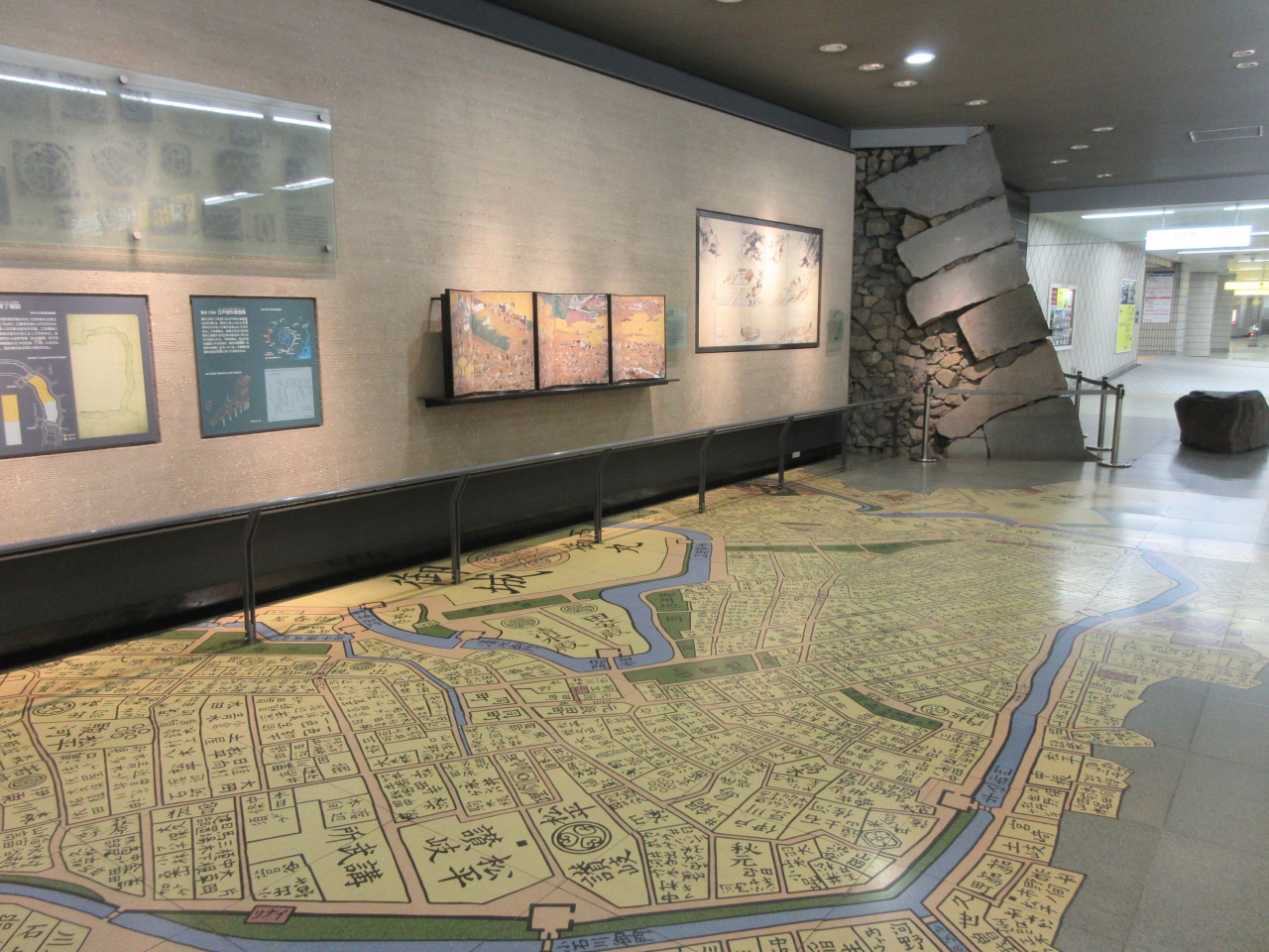 メトロ南北線のホームから上がった通路にあります。床に江戸城周囲の細かな地図があり、御三家の屋敷の広さがわかりました。駿府城築城図屏風や小田原藩大久保家の石曳図や江戸城石垣の刻印などが展示してあります。雉子橋から出土した石垣の再現もあり、博物館の展示室のようでした。石の椅子が3個あり、座っている人がいました。地下鉄市ヶ谷駅を利用する際、寄ってみてはいかがでしょうか。