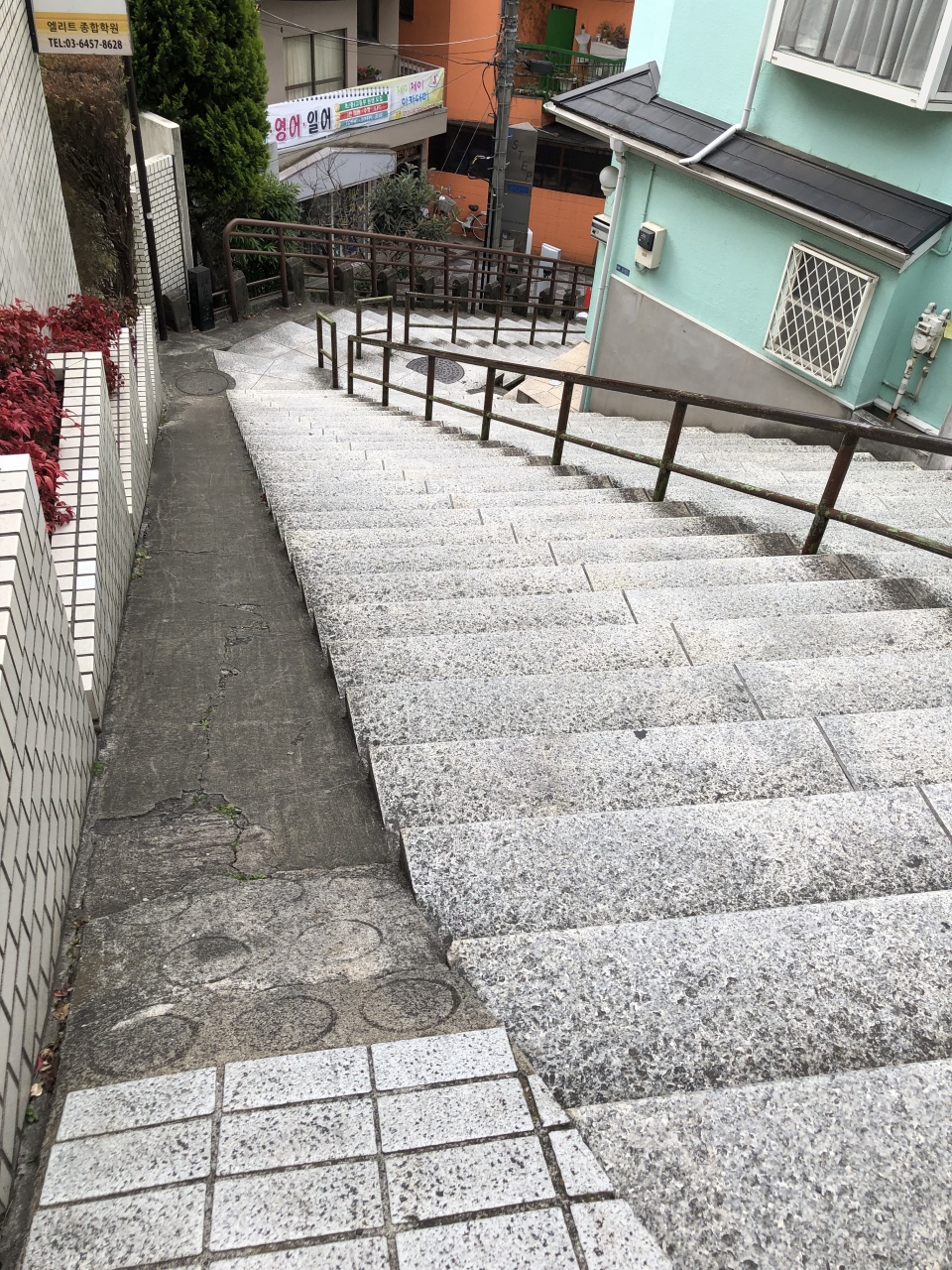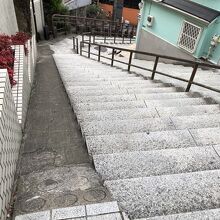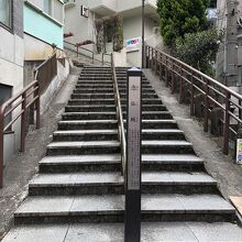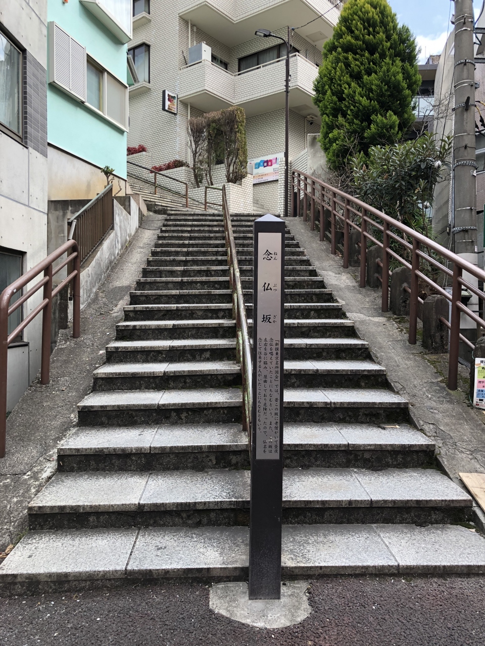曙橋駅A2出口を出て、右に歩くとあけぼの橋通り商店街があります。進んでいくと花屋の角の路地に階段があります。この階段坂が念仏坂です。説明柱に名前の由来が記されています。中ほどの曲がるところに石柱がありました。手すりがついている急な階段です。段ではなく土の道だと転げ落ちそうな坂で、危険だったでしょう。