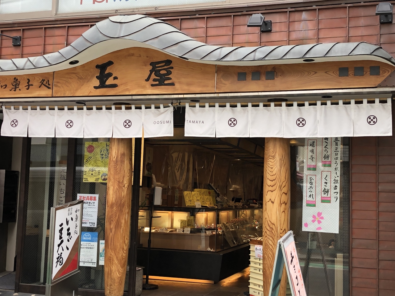 曙橋駅A2出口を出て、右に歩くとあけぼの橋通り商店街があります。進んでいくと右に唐破風のような飾りのある和菓子店があります。大正元年創業の老舗です。元祖いちご豆大福が名物です。大福や饅頭やどら焼きは種類が多いです。生地で餡と苺とクリームを挟んだ和風ショートケーキ、和風アップルパイ、きれいな色の桜モンブランなどの洋風和菓子もあります。粒餡のいちご豆大福とトラさんのバナナを買いました。小さな苺の酸味と餡の甘さと柔らかな餅が美味しかったです。甘いバナナを甘さ控えめの白餡で包み、トラ模様の生地で包んだトラさんのバナナは食べ応えありました。白餡と生地の切り落としが入ったお得な袋もありました。平日午前10時過ぎに訪れた時、自分の後にすぐ客が入ってきました。洋風和菓子が魅力的でした。