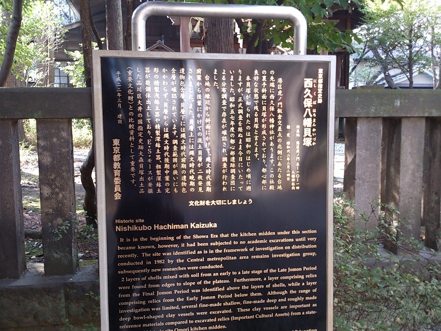 東京メトロ日比谷線神谷町駅から徒歩5分程度、港区虎ノ門5丁目に鎮座する西久保八幡神社の社殿の裏手斜面にあります。昭和の初めころに発見され、昭和57年から本格的な調査が行われたそうです。縄文時代後期の貝層から完形土器も数点出土し、東京都の文化財に指定されています。縄文時代は、この辺りが海岸線だったのですね。ちょっとびっくりです。