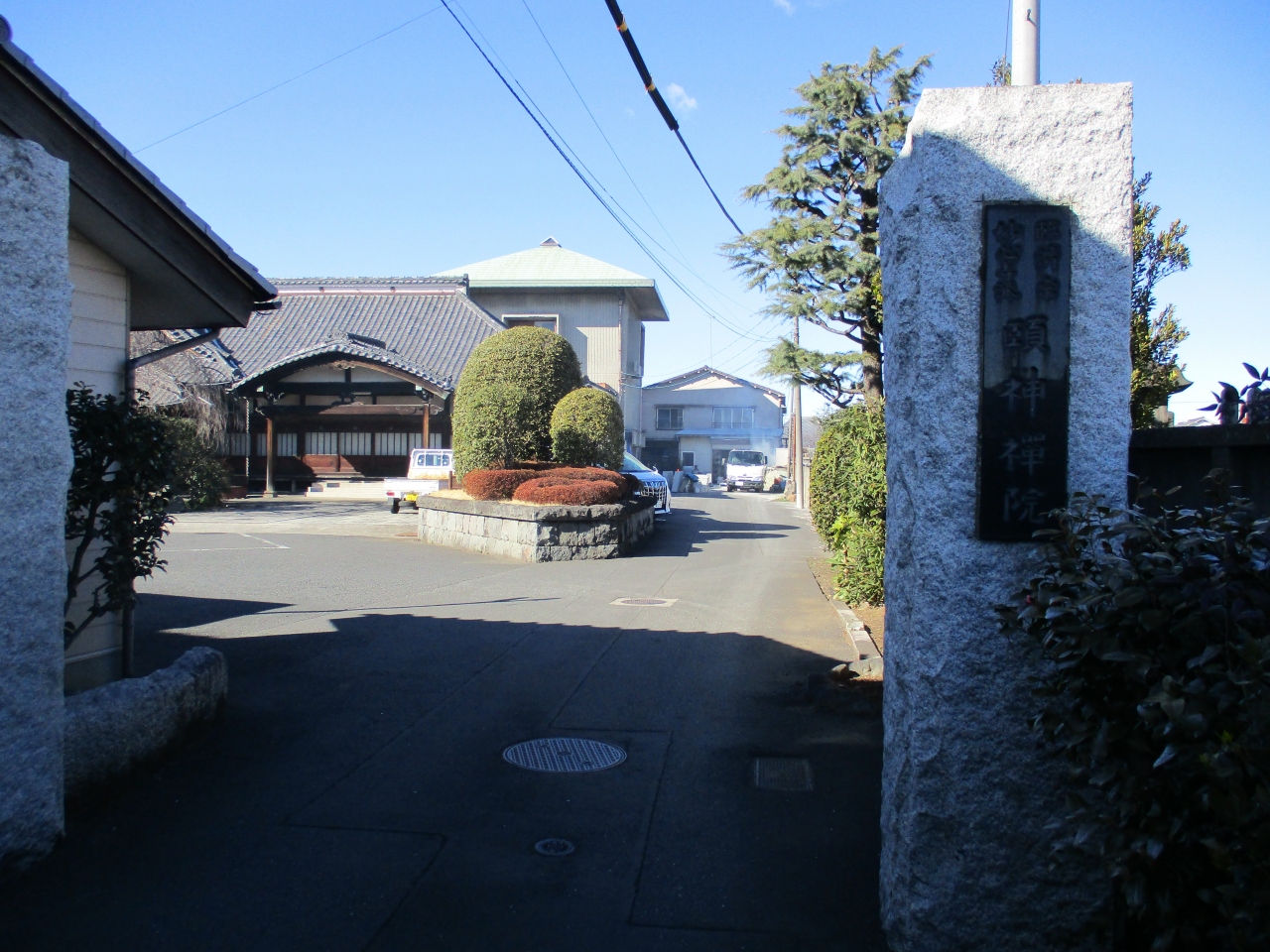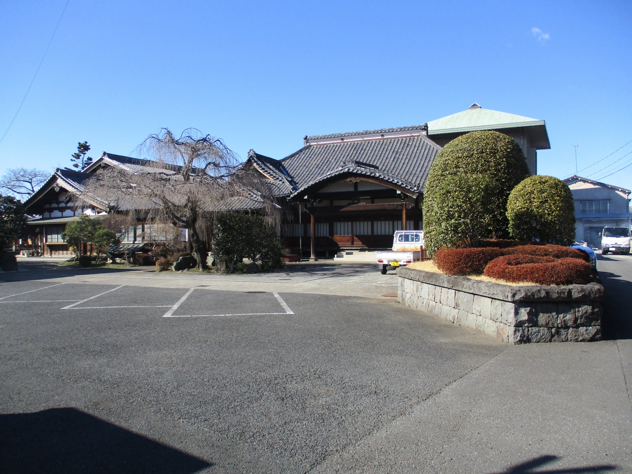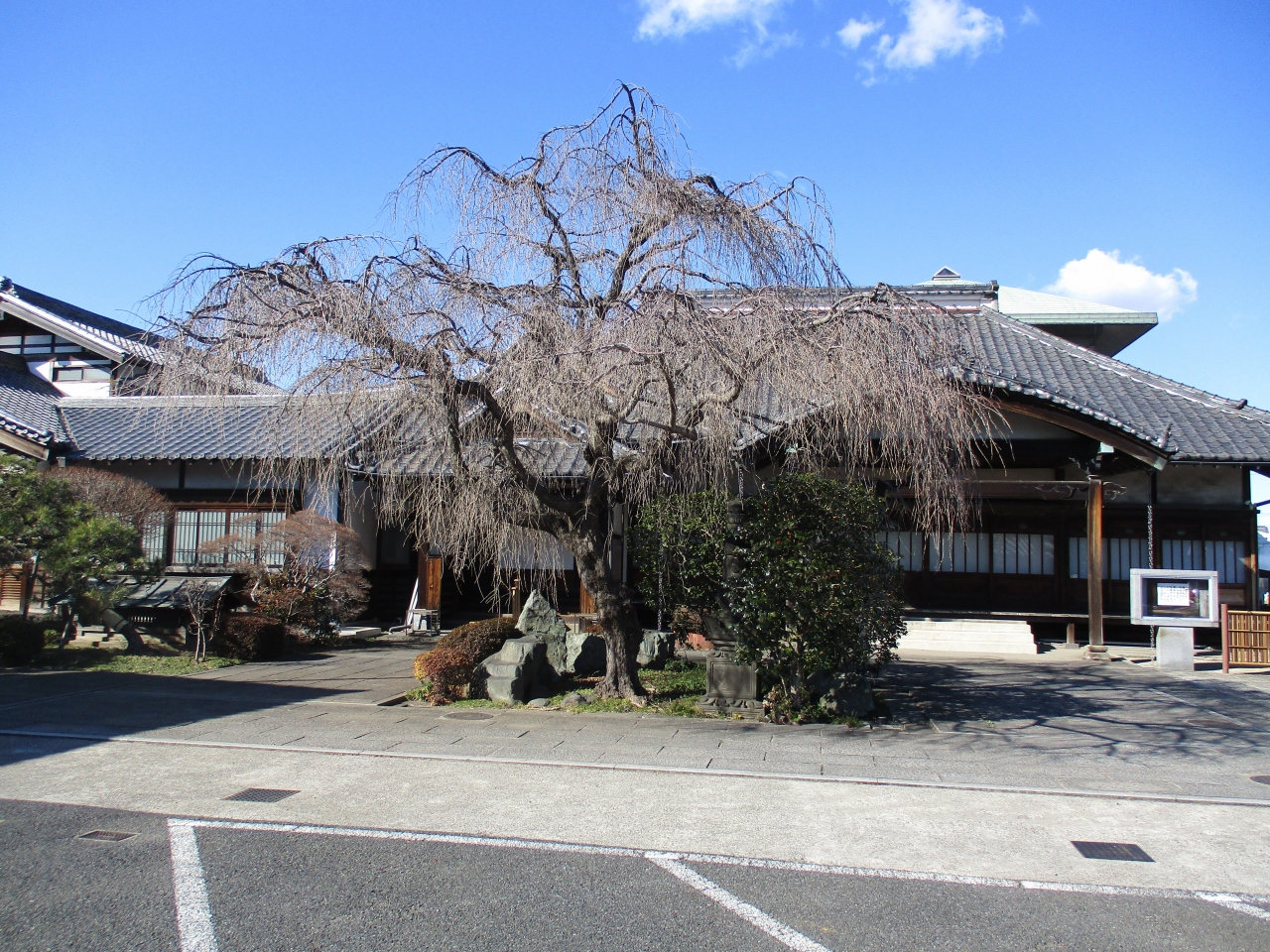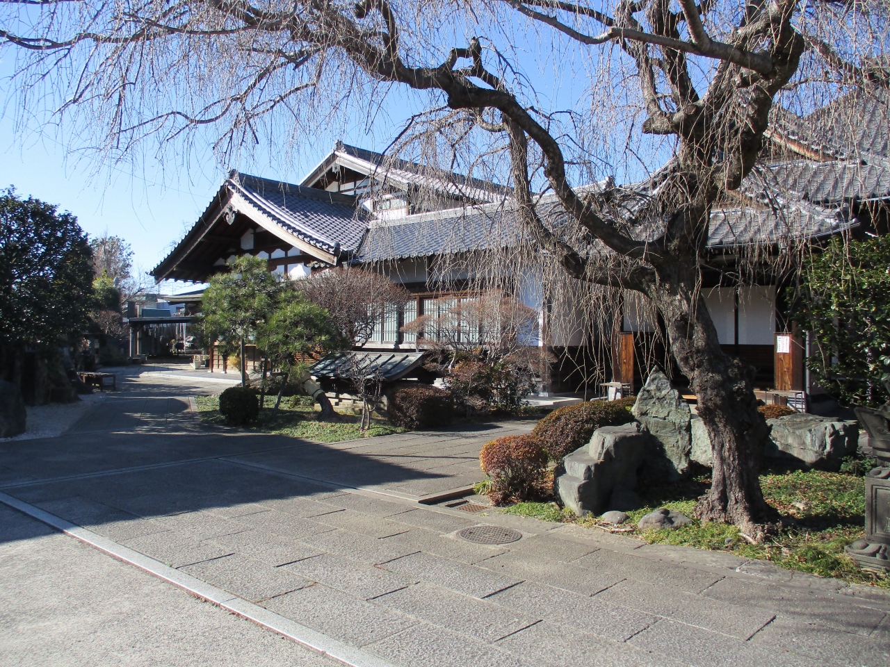 谷中界隈のお寺巡りをしていて立ち寄りました。門柱を通り過ぎて敷地に入ると、コンクリートで舗装された広々とした境内が広がっていてびっくりしました。本堂の前に枝垂桜の木があって、時期が来たらさぞきれいな景観だろうと思いました。