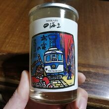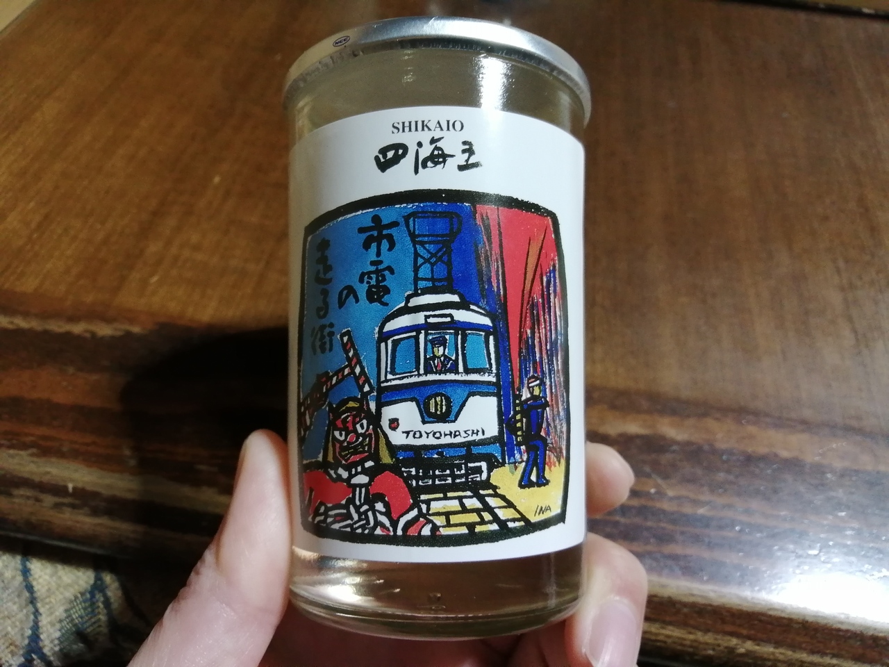 “蔵元直売”の文字が気になったので立ち寄ってみました。店の方に伺うと、残念ながら豊川には蔵元はないとのこと。で、お隣りの豊橋市にある「福井酒造」の日本酒を勧められてので「四海王(しかいおう)」のカップ酒(税込250円)を購入しました。ラベルには豊橋市内を走る路面電車が描かれており、お土産には最適かなと思います。