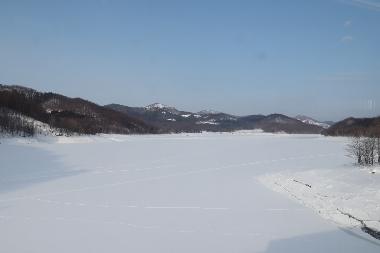 根室線の車窓から眺めることができました。南富良野町のダム湖です。夏にカヌーを楽しんだことがありますが、訪れた2月は氷結したうえに雪が積もり、真っ白な雪原になっていました。乗車した根室線も廃止が決まったようです。