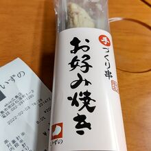 いづのといえば、広島名物がんすだが、今回はお好み焼き串を購入した。お好み焼きと言っても広島のお好み焼きのようにそばや肉が入っているわけでない。キャベツやゲソ、ネギや生姜が混ぜ合わさった練り物でお好み焼きのような感覚で食べれる串だ。たしかによくできており、関西風のお好み焼きを食べているようだ