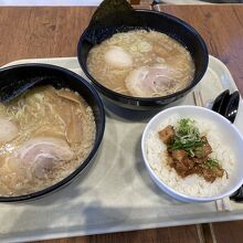 アウトレットの買い物途中のランチで利用しました。寒い日だったので迷わずラーメンに決めました。豚チャーシュー丼のセットを頂きました、ラーメンには味玉子をトッピングしました。豚骨醤油味のラーメンに良く合って美味しかったです。