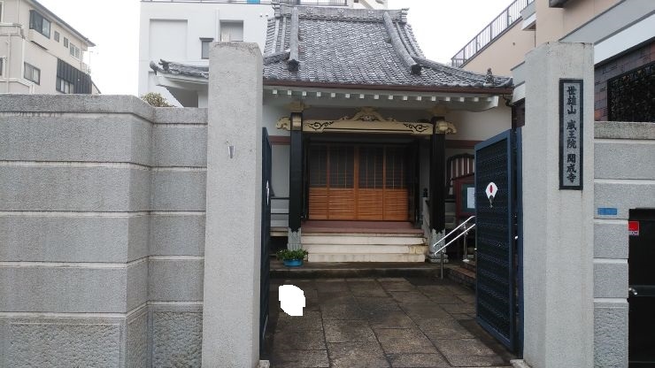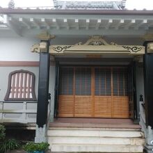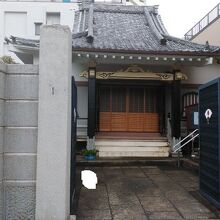 周辺は多くのお寺が立ち並んでおり、この区画は複数のお寺が立地。コンパクトな敷地に庭木も配置されている。本堂のデザインが趣があり、お寺らしい個性が感じられた。門につけられた日本国旗の扇子も個性を感じた。