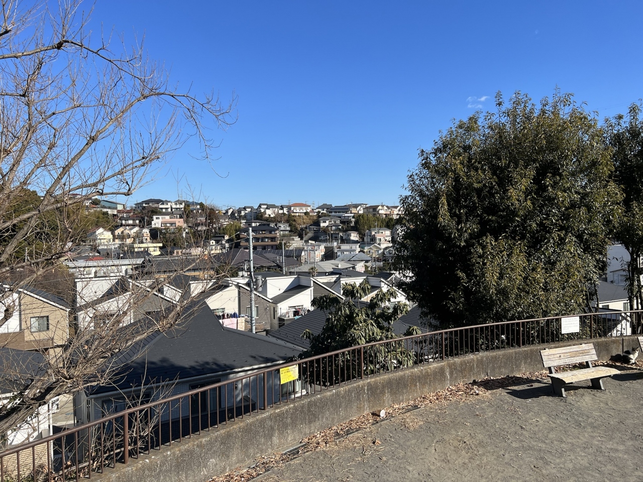 戸塚駅から2キロのところにある公園で、周囲は閑静な住宅街です。公園の入口を入ったところには広場があり、その真ん中には小さなすべり台があります。公園は高台にあるので、戸塚の街を見下ろせる、眺めの良いロケーションです。