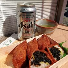 もちろん、稲荷寿司をいただきました。店内ではなく店先で売られている“持ち帰り用”を購入。五目稲荷4個、わさび稲荷3個の入った「ミックス」、お値段税込780円。店の前のイスで食べていたらお茶を出してくれました。稲荷の揚げは甘くてジューシー。わさび稲荷がうまいです。1つ食べたら無性にビールが飲みたくなり追加購入。スーパードライ350ml缶が350円でした。