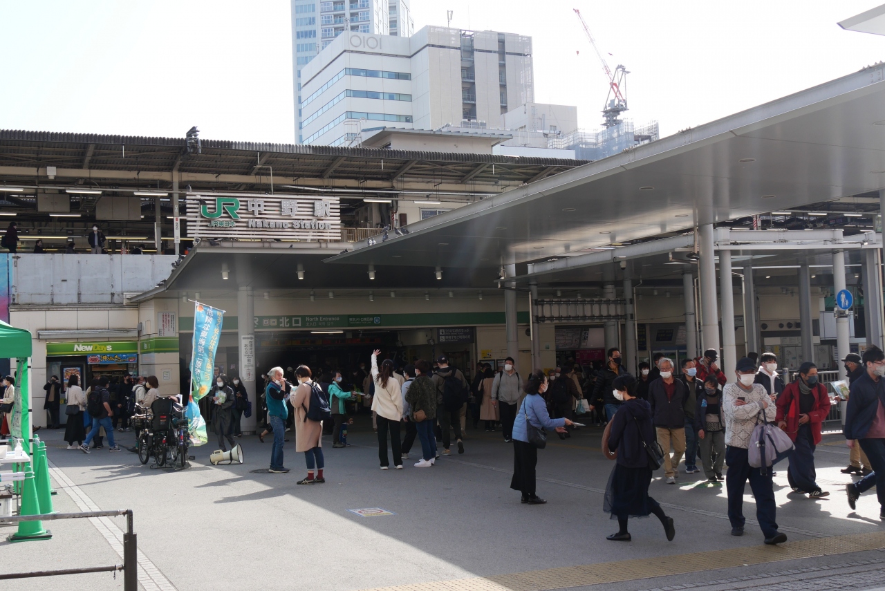赤い電車の中央線快速、黄色い電車の中央線総武線普通電車に東京メトロ東西線が接続する利用者の多い駅です。
