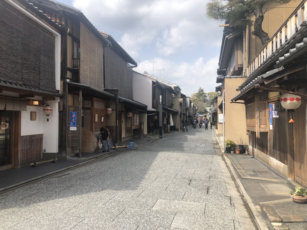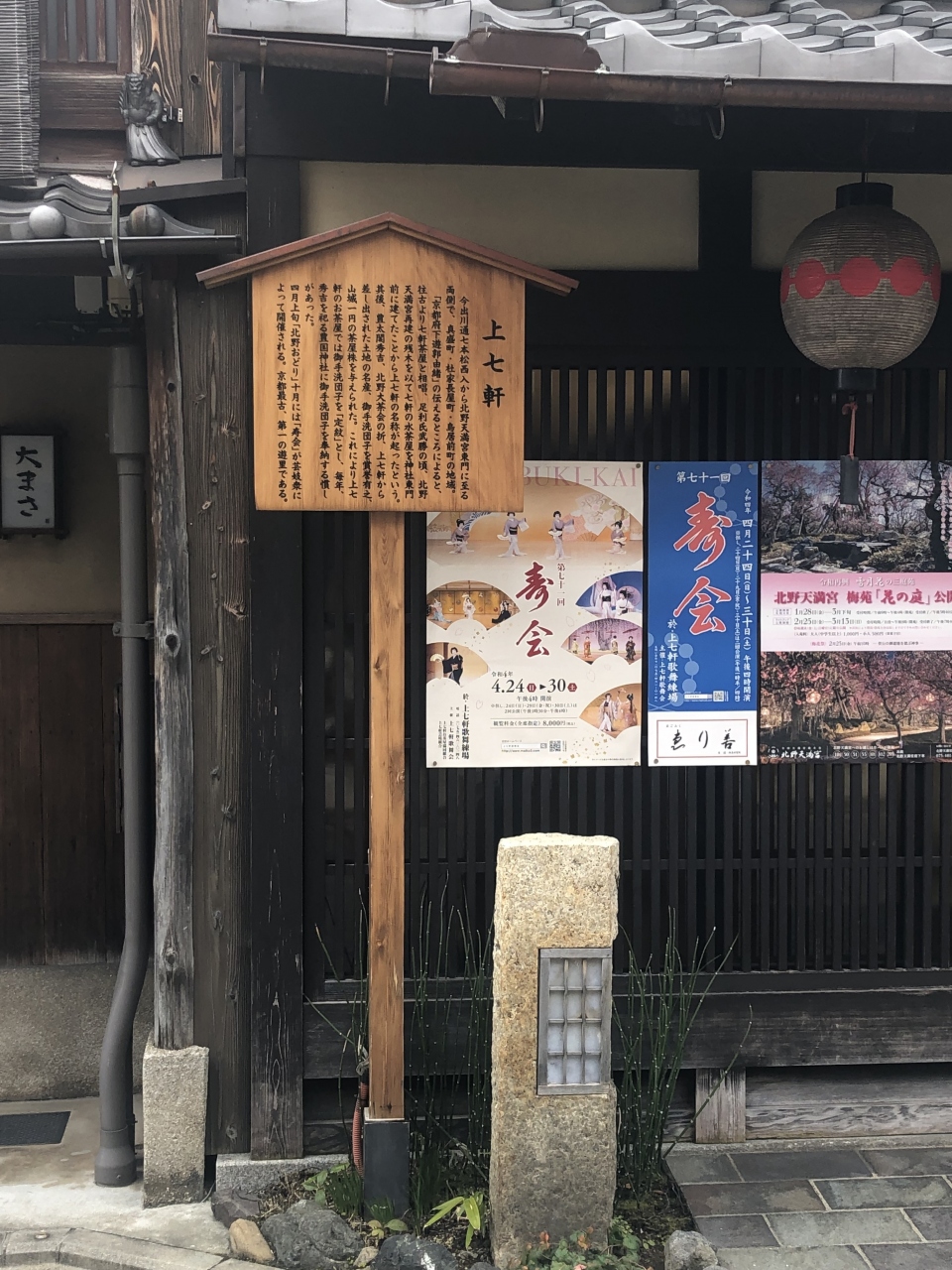 北野天満宮の東側、京都の五つの花街の中で最古の歴史を持つ上七軒。室町時代に北野天満宮の再建の際に残った資材を使って7軒の茶店を建てた。これが「上七軒」の由来です。今出川通から北野天満宮へ向かう参道約400m、石畳に千本格子のお茶屋がとても雰囲気があります。今風に改装されたお店もあります。