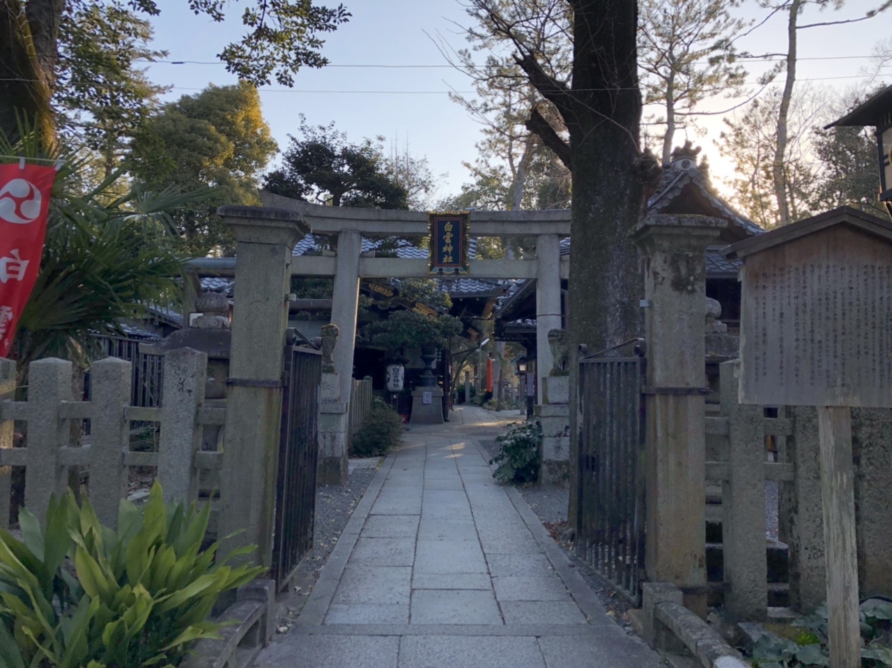 こちらの神社はちょうど御苑の中ほどにあり、梅林の道の向かいにあります。