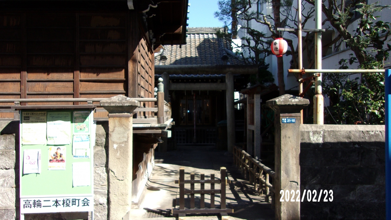 この丸山神社は現在は高輪にある広岳院の入り口近くにあります。この神社は広岳院が芝で創建された時に境内に在ったということです。17世紀中ごろに広岳院が今の場所に移築するときに一緒に移築してきています。現在は神仏分離が行われているので独立しています。狭い敷地ですが社殿だけだなく舞殿もあります。社殿の脇には通力稲荷神社があります。脇にひっそりとたてられていますが存在感があります。