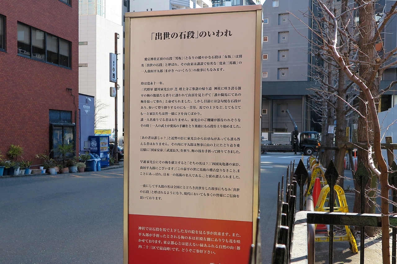 - 1.正面の有名な男坂(出世の石段)、2.右手の緩やかな女坂、3.愛宕山トンネルのエレベーター、私はもちろん3を選択
