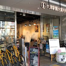 JR大津駅前にある観光案内所です。パンフレットコーナー、土産品コーナー、サイクリング貸し出し受付などがあります。観光案内所に隣接して、カプセルホテル・レストランなどが入った複合施設「カレンダー」や、近江ちゃんぽんの店もあり、おすすめです。