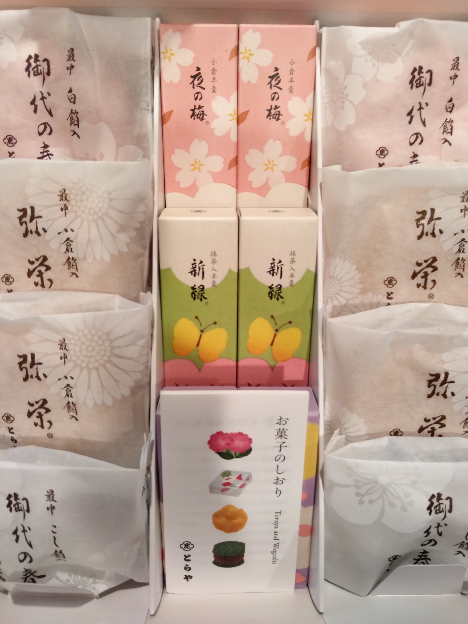 とっても重厚な老舗の雰囲気のあるとらや。和菓子屋さんらしく、季節に合わせて菓子はかえないけど、パッケージはかえてます。定番の羊羹も味は、おなじだけど、春バージョン。
