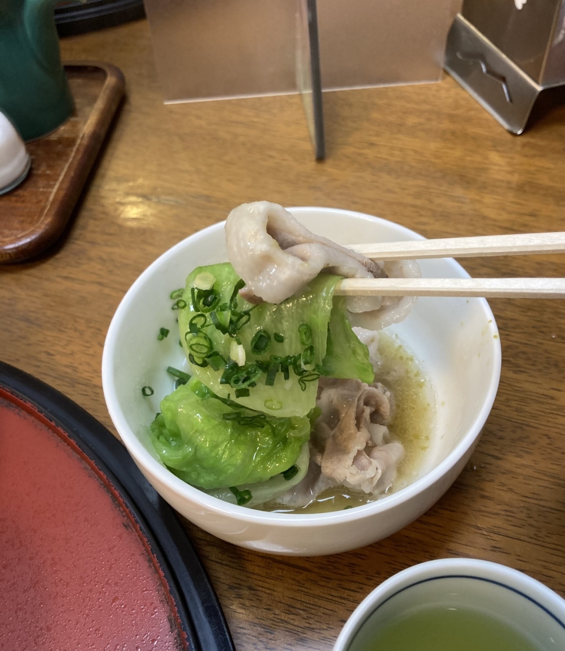 その場で「黒くま(黒い鉄鍋)」でレタスと豚バラ肉をしゃぶしゃぶしてサーブしてくれます[↑]