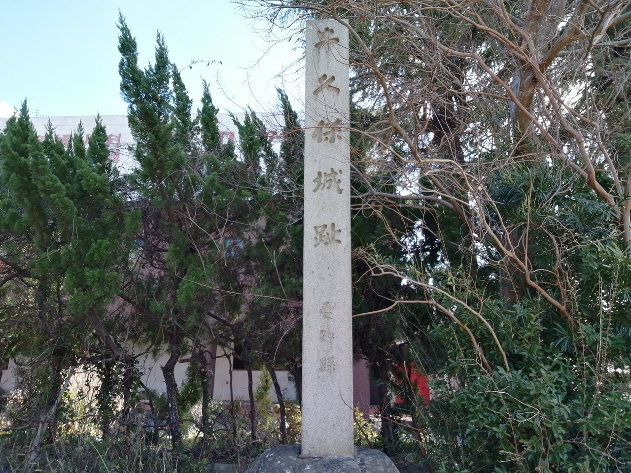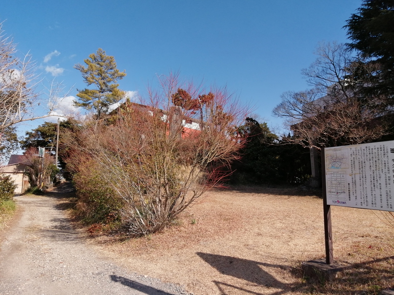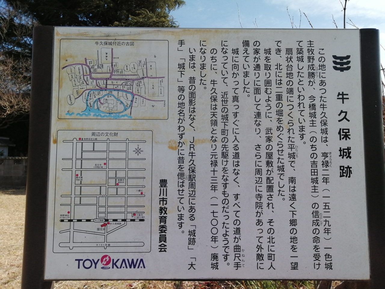 JR飯田線牛久保駅の隣り、線路沿いにあります。ありますといってもただ“空き地”に「牛久保城址」と書かれた石柱があるのみです。過去の調査では遺構が確認されたようですが、現在は残されていません。唯一の名残りとして周辺の住所の一部に“城跡”、“城下”などが付けられているようです。実際に牛久保城跡の南西250mほどの豊川街道の交差点名は「城跡」となっており、看板の文字で確認することができます。