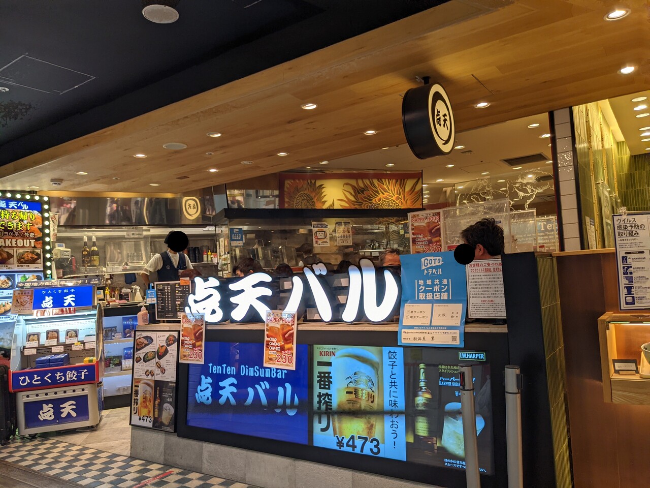 JR新大阪駅の改札内(エキマルシェ新大阪)にあるひとくち餃子でお馴染みの点天のバルです。焼きたてのひとくち餃子は、ジューシーでおつまみに最適でした。ハッピーアワーなら、ビール、ハイボールなどが230円とお得な料金で飲むことができます。