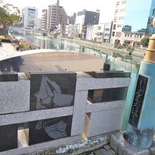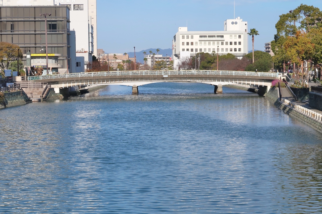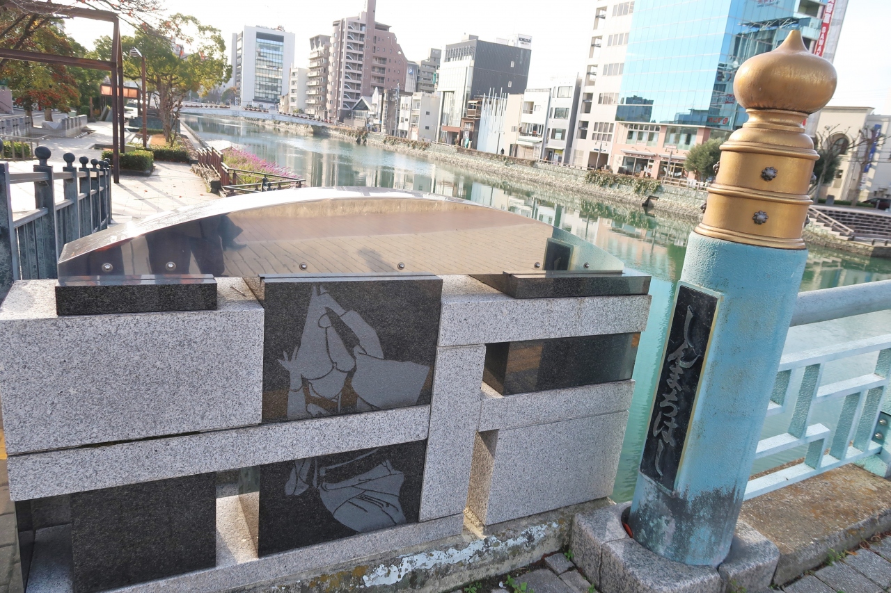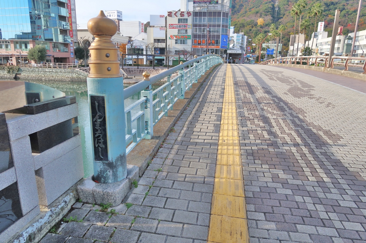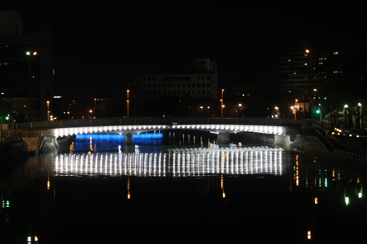 徳島駅から眉山方面へ行くときに渡る橋で、かつては徳島城から眉山をつなぎ、徳島の商業の中心としてにぎわっていたようです。橋を渡る際に路面をよく見ると、橋の上を踊りながら眉山方面へ進んでいく踊り子のシルエットがありました。暗くなると、白色LEDのライトアップ「光のマトリックス」が始まります。点滅する白い光のラインが、新町川に反映して幻想的でした。
