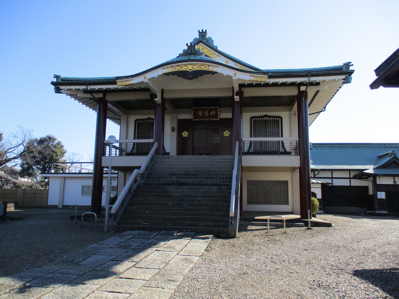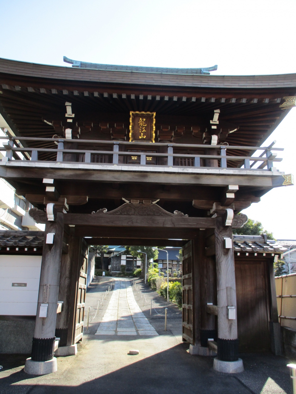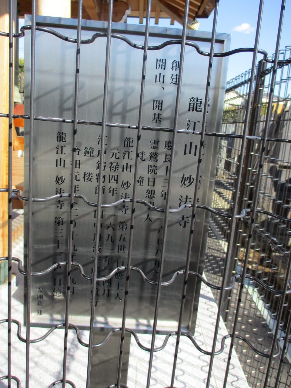 谷中の妙円寺に行った時に、どこまでが別のお寺の境界か迷うぐらい敷地が隣接しているお寺に立ち寄りました。立派な山門を進むと、本堂の近くに真新しい鐘楼がありました。高さは低くて案内板も立てられていましたが、柵で囲われていてあまり趣などはありませんでした。