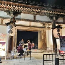 東寺の東側にある入口門で、風格ある立派な門です。大通りに面していて、京都駅八条口から歩いて訪れると最初に見えてきます。鎌倉時代前期に建造され、国の重要文化財に指定されています。参詣者入口となっている門で、夜間のライトアップで訪れた際にも拝観受付が行われていました。