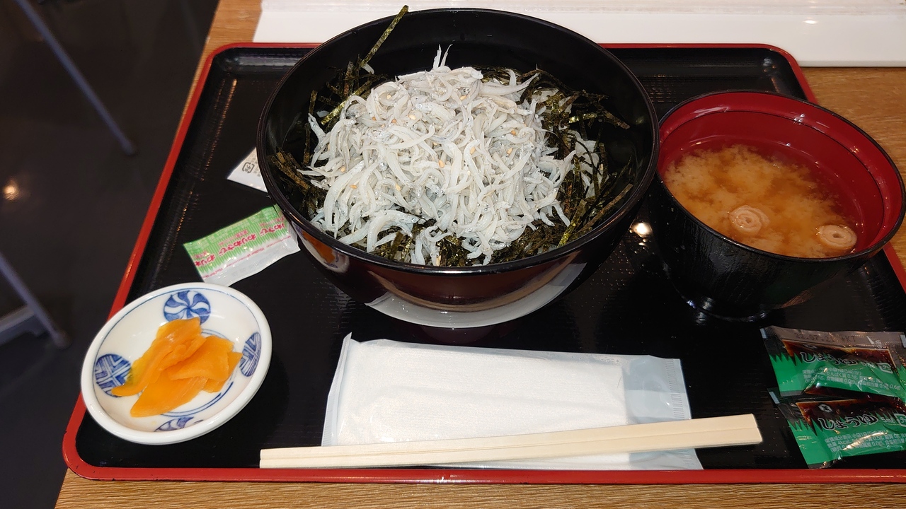 お土産は購入済みなのでその2階にあるフードコートでランチにお蕎麦としらす丼をいただいた。お手軽でまずまずのお味でした。