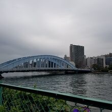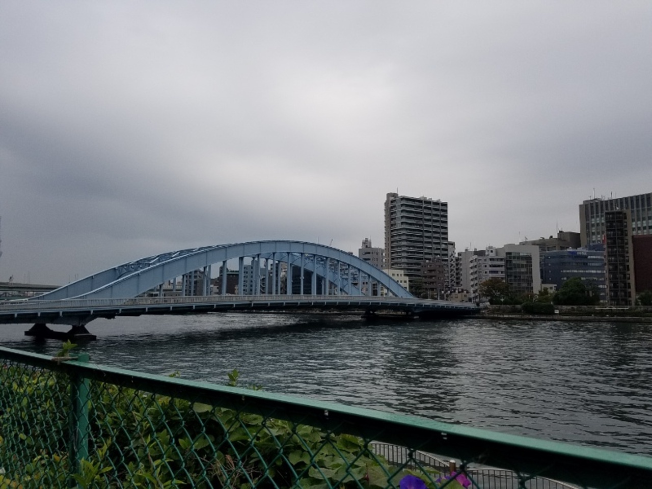 中央大橋から隅田川テラスを歩いてきて新川公園に入ると花壇や樹木のせいで意外にも隅田川が見づらいのですがフェンス越しにちょうどよい大きさと角度で永代橋を見ることができました。なみなみとした川面の上に優雅に架かる橋の姿を目に焼き付けて用事を済ませに歩を進めました。