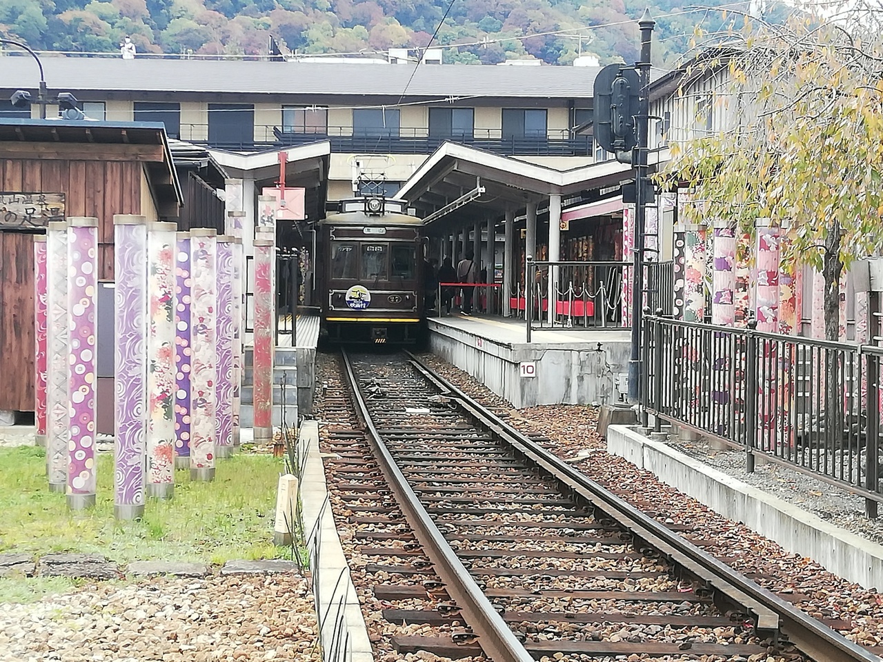 嵐山駅の南側に、着物柄の柱が続く道があります。夜間のライトアップが素敵とのことでしたが、予定の都度で昼間に訪れましたが、とても綺麗でした。色鮮やかな着物柄が京都にいることを感じさせてくれます。嵯峨嵐山駅に向かうためそのまま踏切を渡りましたが、ちょうど電車が止まったいて、気に入った写真が撮れました。