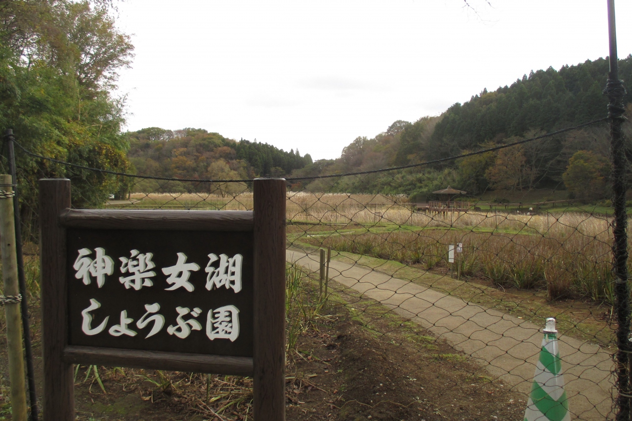 神楽女湖は、志高湖からさらに奥に進んだところにありました。ここも鶴見岳南東側山腹にある小さな湖ですが、阿蘇くじゅう国立公園となります。志高湖とは遊歩道で結ばれているそうなので、歩く人も多いのではないかと思います。平安時代に鶴見岳社の歌舞女が住んでいたという伝説から名が付いたそうです。ここは菖蒲園として有名だそうで、約80種、15、000株、約30万本の花菖蒲が咲くそうです。1年に1ヶ月だけ表舞台に登場する湖なのですね。そこを訪れたのは11月ですから物好きの骨頂です。