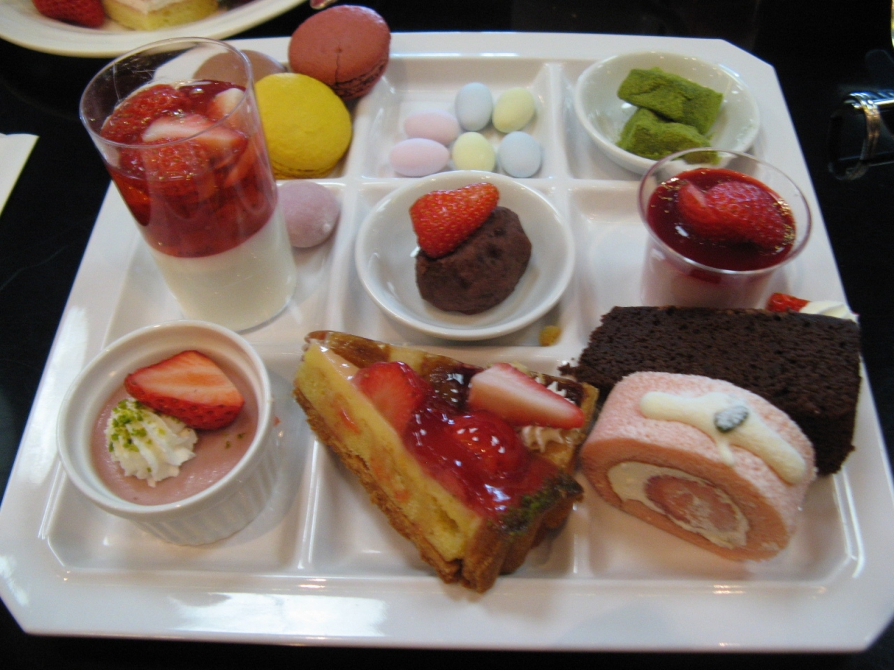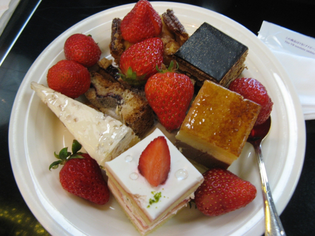 バイキングコーナーには、3種類のフレッシュ苺が並ぶコーナーをはじめ、苺のチョコレートファウンテン、苺スフレ、苺のミルフィーユ、苺タルト、苺ロール、苺ムース、苺ショートケーキ、苺クレープなど苺づくし、その他にもアイスクリーム、フルーツ盛り合わせ、おはぎ、大福、抹茶わらびもちなどスイーツがたくさん。軽食コーナーには、自分で作るチーズバーガー、石窯焼きピッツァ、ビーフカレー、野菜のミネストローネ、一口いなり寿司などランチとしては充分な内容。流石に一流ホテルのケーキ類だけあってどれも丁寧に造ってあって美味しかったし、軽食類も遅めのお昼も兼ねてお腹いっぱい頂くことができました。