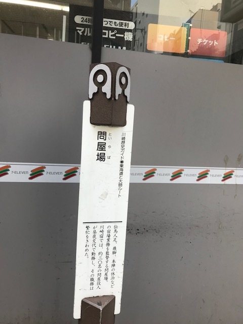 京急川崎駅から少し歩くと砂子交差点があります。そこを左折すると旧東海道があり、問屋場跡の札が立っていました。この札に問屋場の説明が書いてあるだけで、建物などはありません。旧東海道のもう少し先に東海道かわさき宿交流館があってそこに入って初めていろいろわかりました。