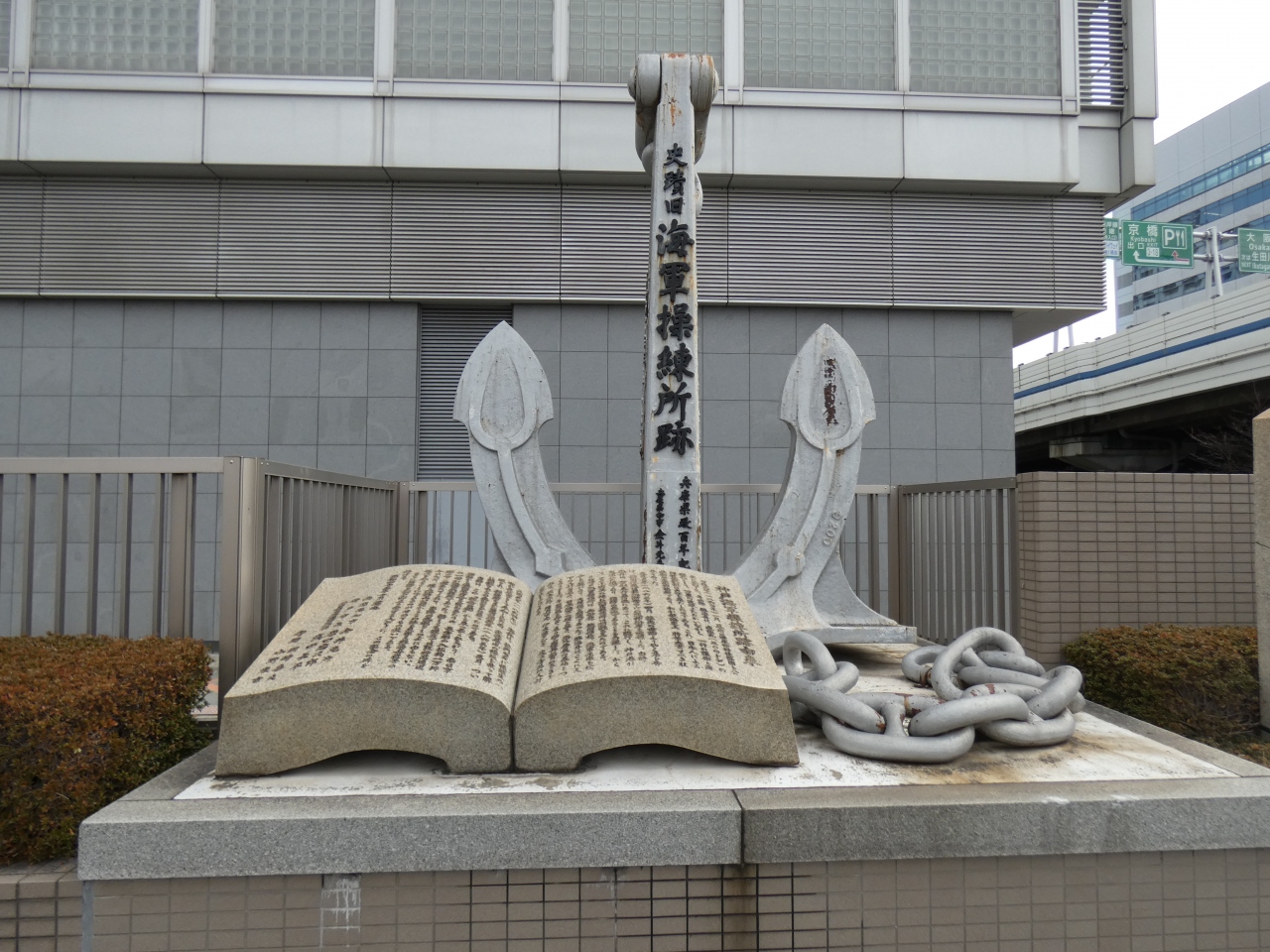 旧居留地海岸通り京橋筋交差点南東角にある碇をかたどった石碑。江戸時代元治元年(1864)江戸幕府軍艦奉行・勝海舟の提言で神戸に設置された海軍士官養成機関の神戸海軍操練所跡です。慶応元年(1865)まで続いた施設です。ここで勉強した偉人(伊藤祐亨、坂本龍馬、陸奥宗光、望月亀弥太等)は多くいます。