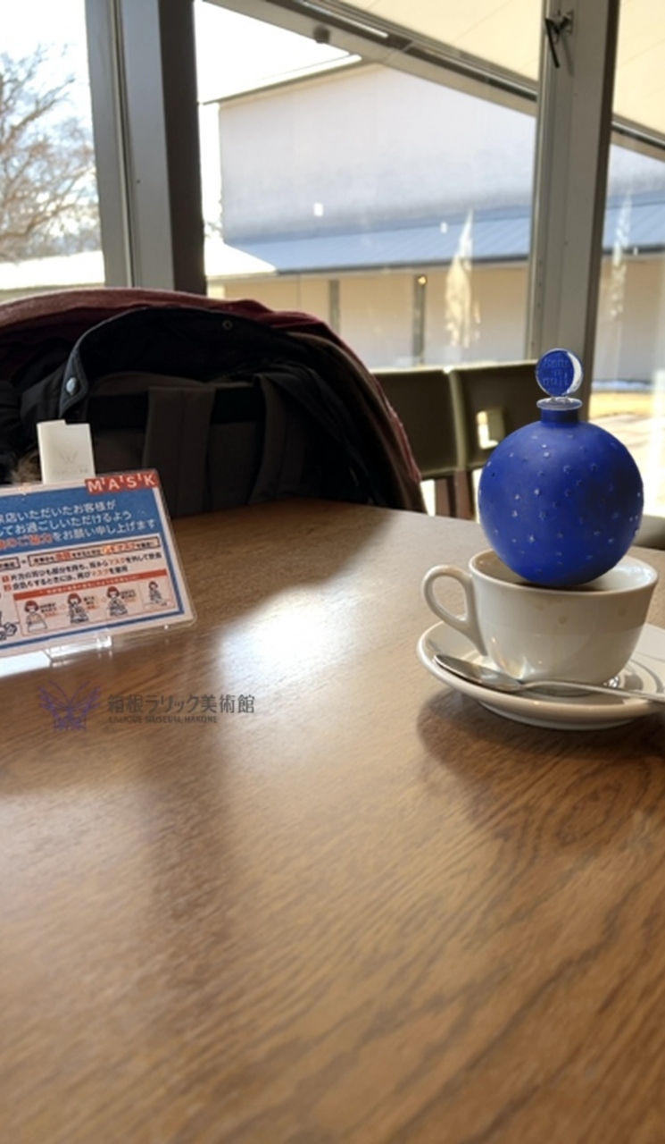 ラリック美術館正門入った左手にあるカフェレストラン。その手前には予約制のオリエント急行カフェ「ルトラン」がある。ちゃんとした食事からデザートまでメニューが豊富。テーブル上に置いてあるQRコードを読むとラリック作の香水瓶が映り込むサービスもあり。香水瓶をイメージしたケーキがエレガントで美味しかった。