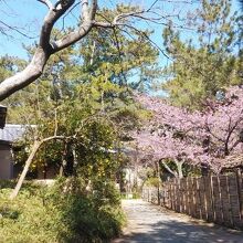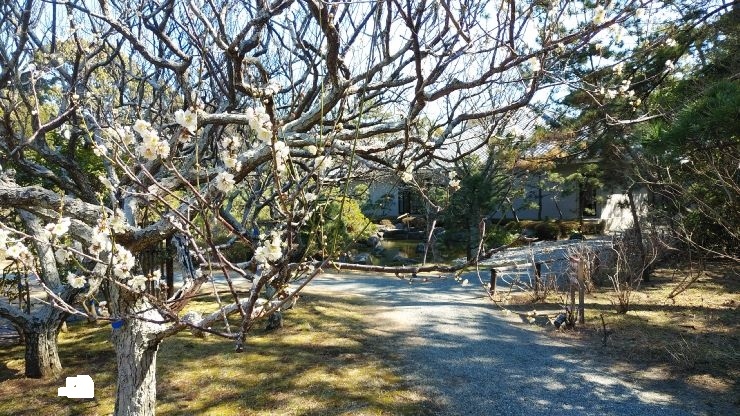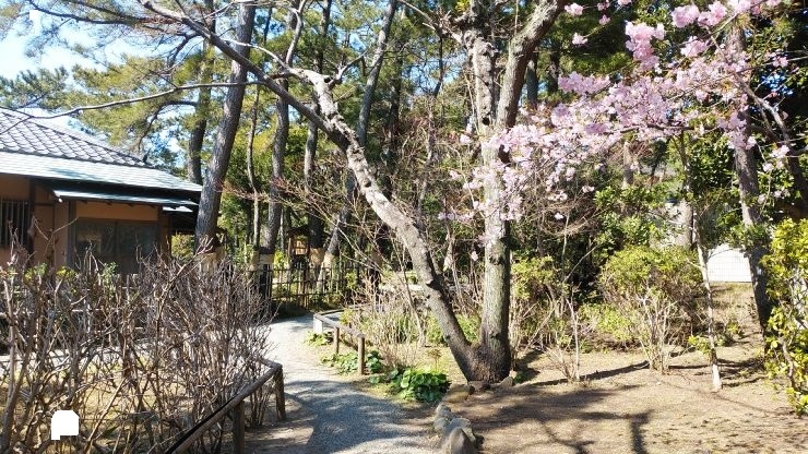 有料施設だが、園内には日本庭園が設けられており、和の雰囲気を味わいながら散策を楽しめた。庭園の周りには黒松林が広がっており、意外と敷地は広め。梅や河津桜も咲き始めており、春の訪れを感じることができた。
