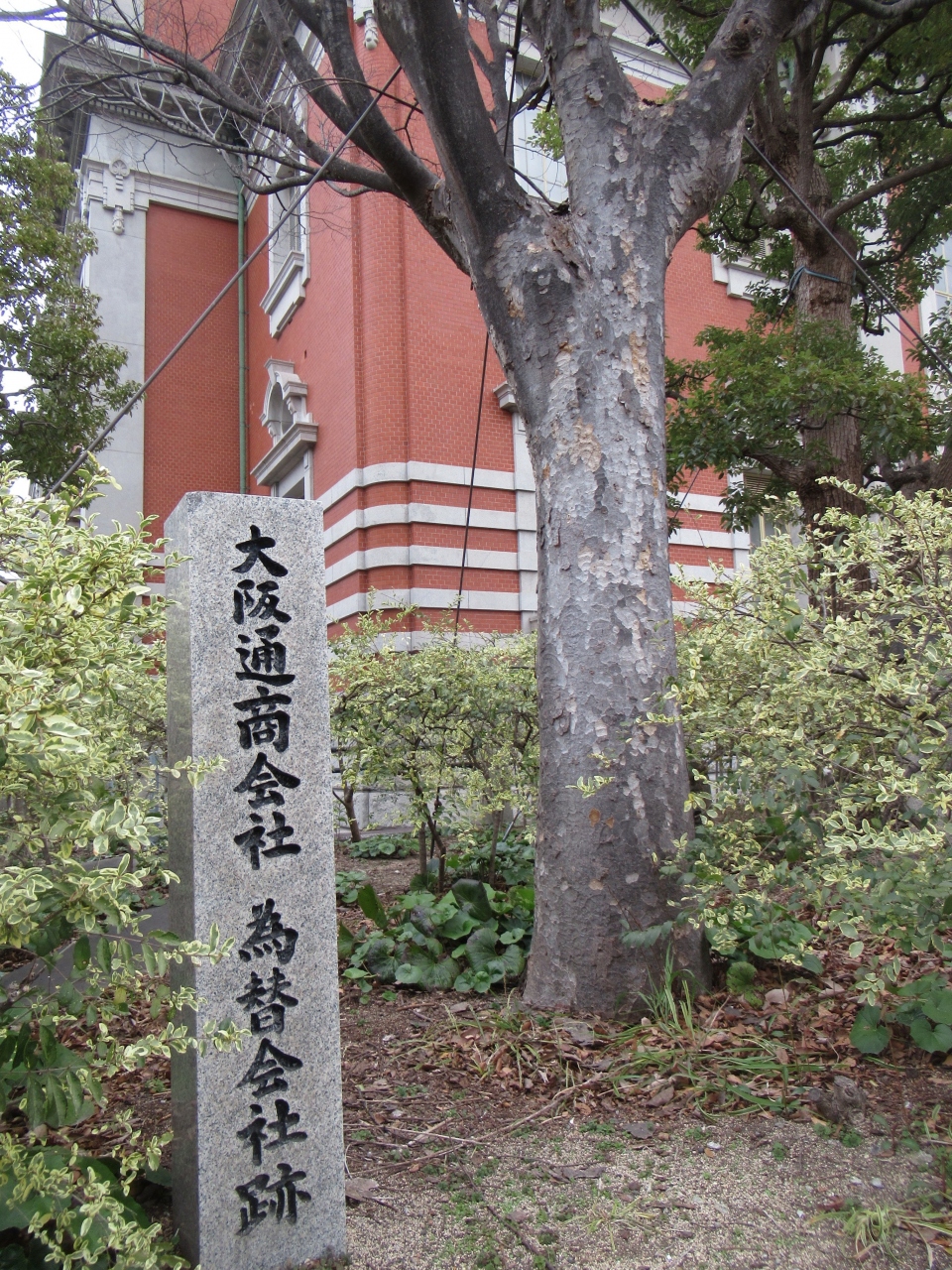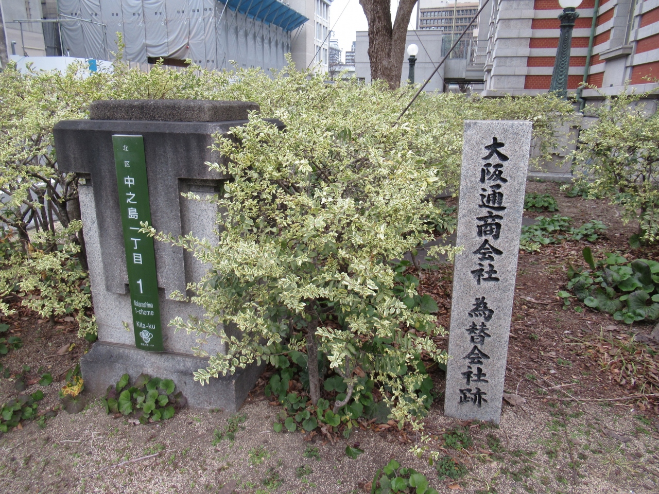 大阪の中之島のあたりを散策していると中央公会堂の南西の角に石碑があって「大阪通商会社 為替会社跡」と書いてありました。