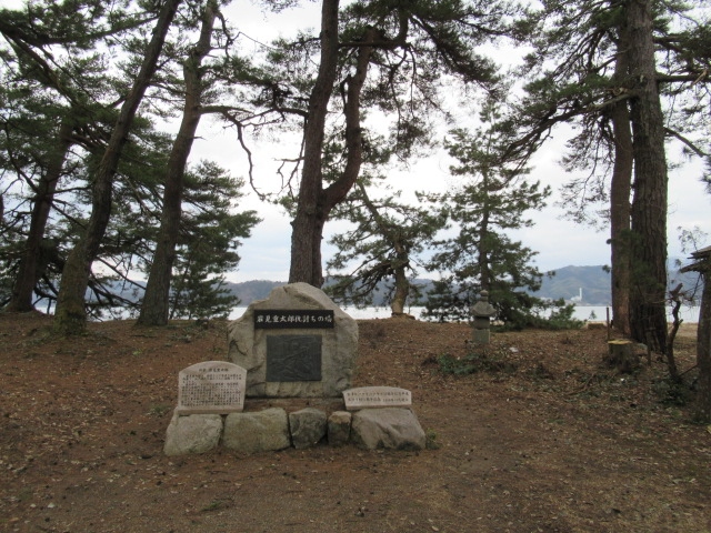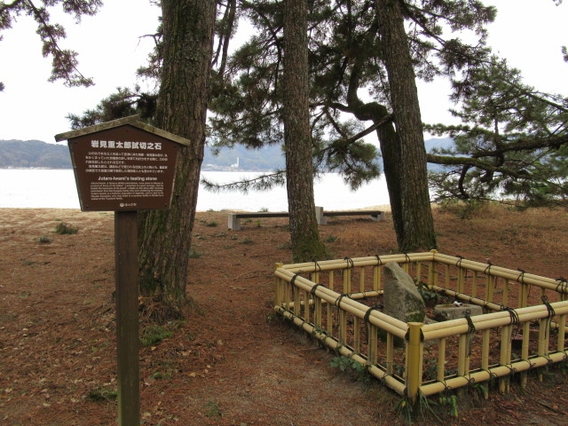 天橋立駅の観光案内所で散策マップをいただき廻旋橋を渡って松原を歩いていると磯清水というお食事処(閉店でした)があり、その奥にこの「石見重太郎あだ討ちの場」が建っていました。