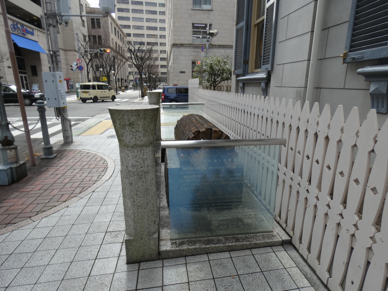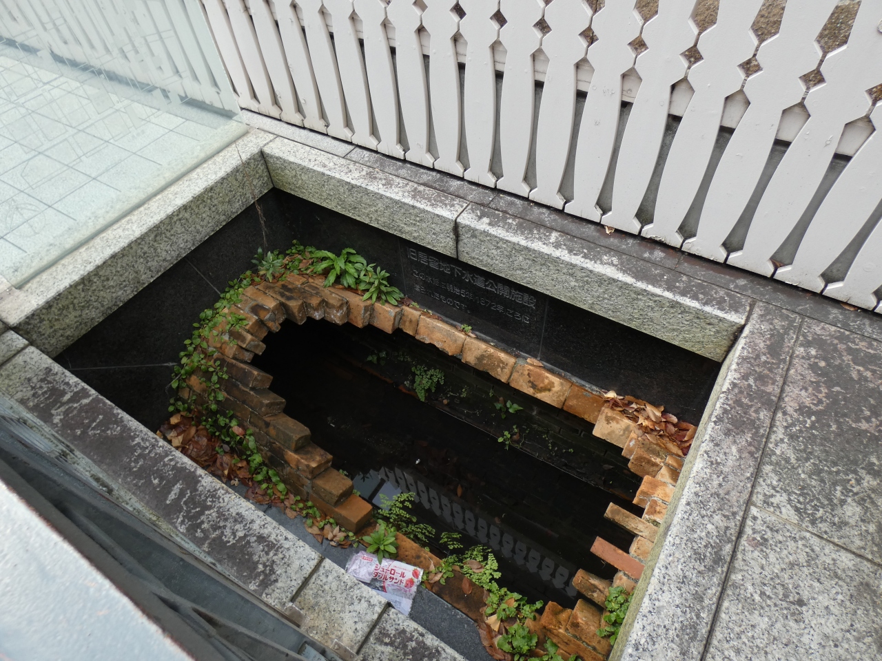 国の重要文化財に指定の旧居留地15番館東玄関脇にある展示遺構。明治5年(1872)に竣工の日本最古の近代上下水道で国登録有形文化財に登録され、近代産業遺産にもなっています。横浜と並んで古い上下水道で、国産煉瓦が使用され旧居留地の中を総延長1880mの大規模敷設だったようです。やはり外国人居留地だからこそですね。