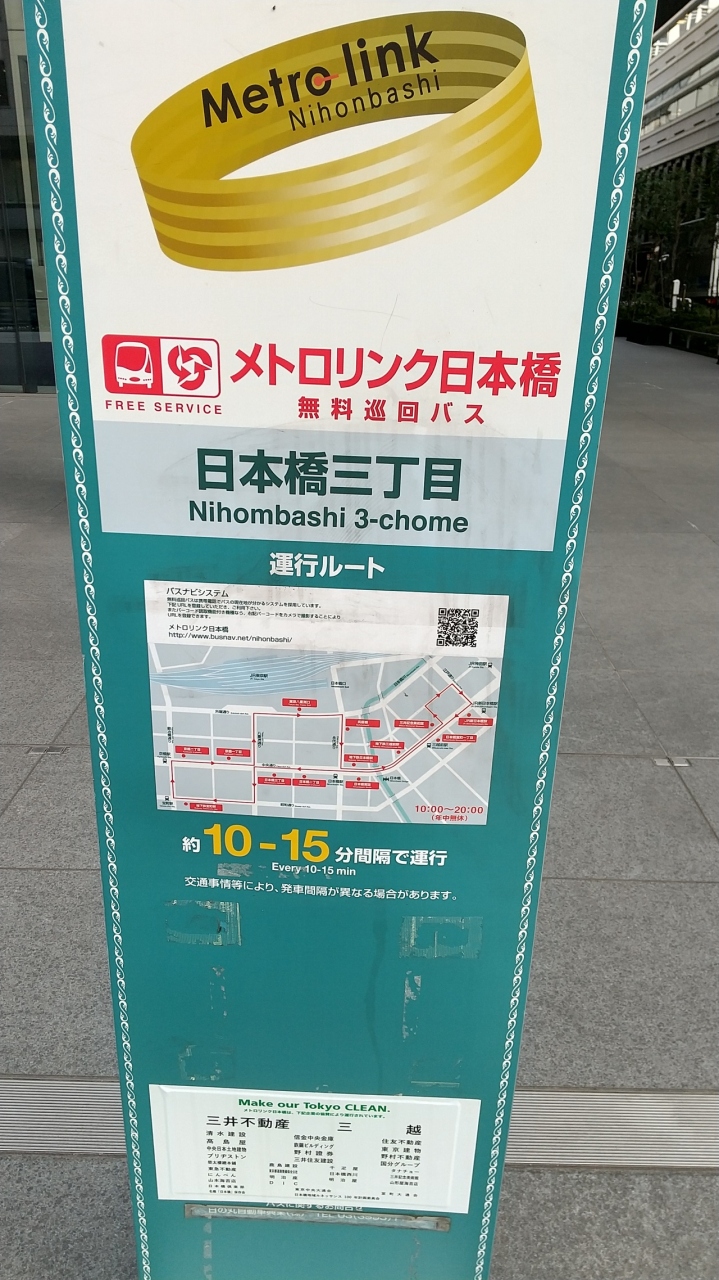 日本橋界隈を走る無料のバスで、三越前の方から京橋の方まで行っているので便利です。ただ乗れたらラッキーという感じであまり乗れたことはありません。というのも時刻表がなく、10~15分間隔とはいえバスを待つか待たないかいつも迷うところです。