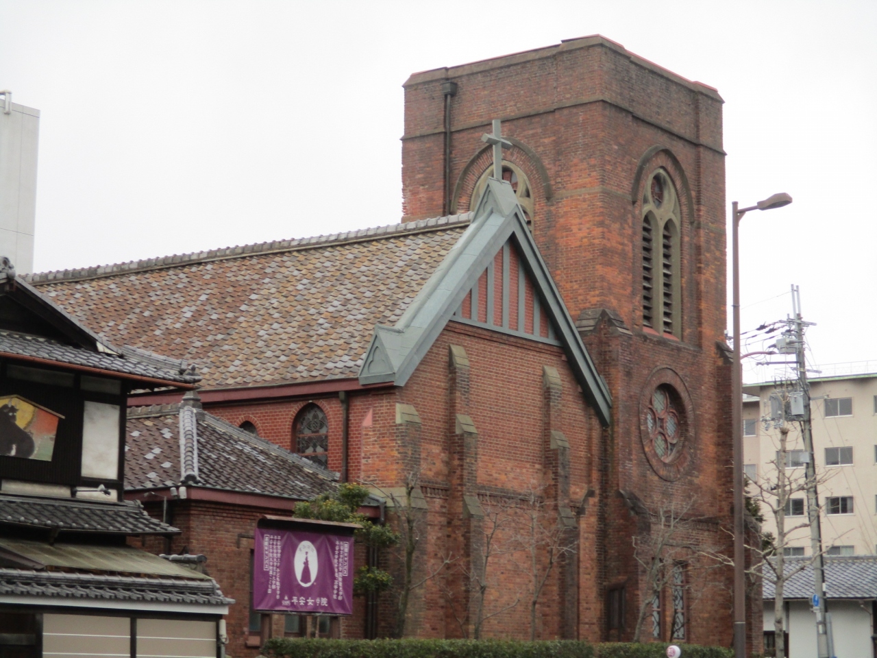 京都御所の西側、烏丸通に面して建っています。平安女学院の礼拝堂として1898年(明治31年)竣工しました。アメリカのJMガーディナーが設計しました。年月を経たレンガの建物がとても趣あります。ここだけ外国のようです。