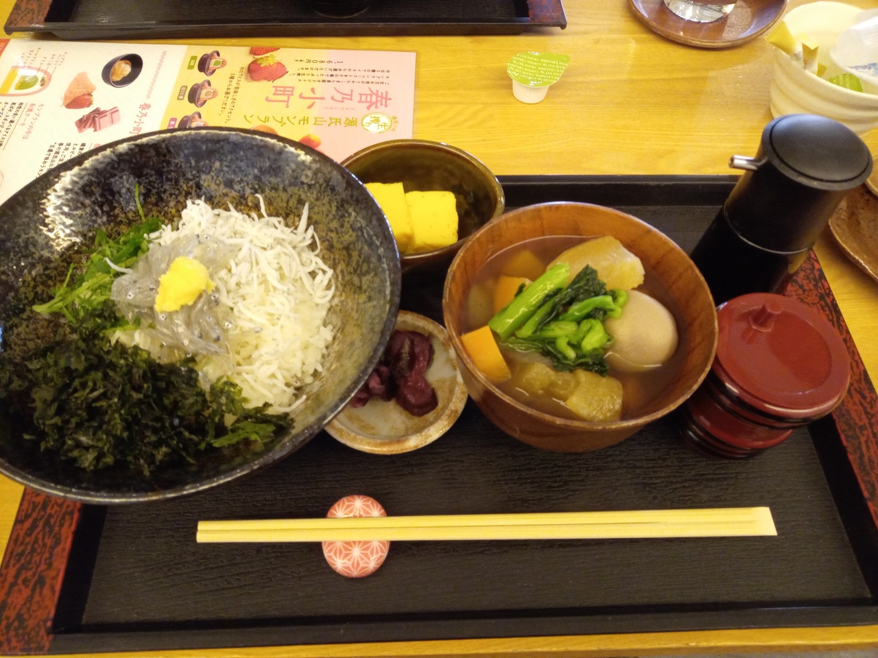 しらす丼は小さめでけんちん汁付。生姜醤油かけて美味しいけど、お腹一杯にならず。