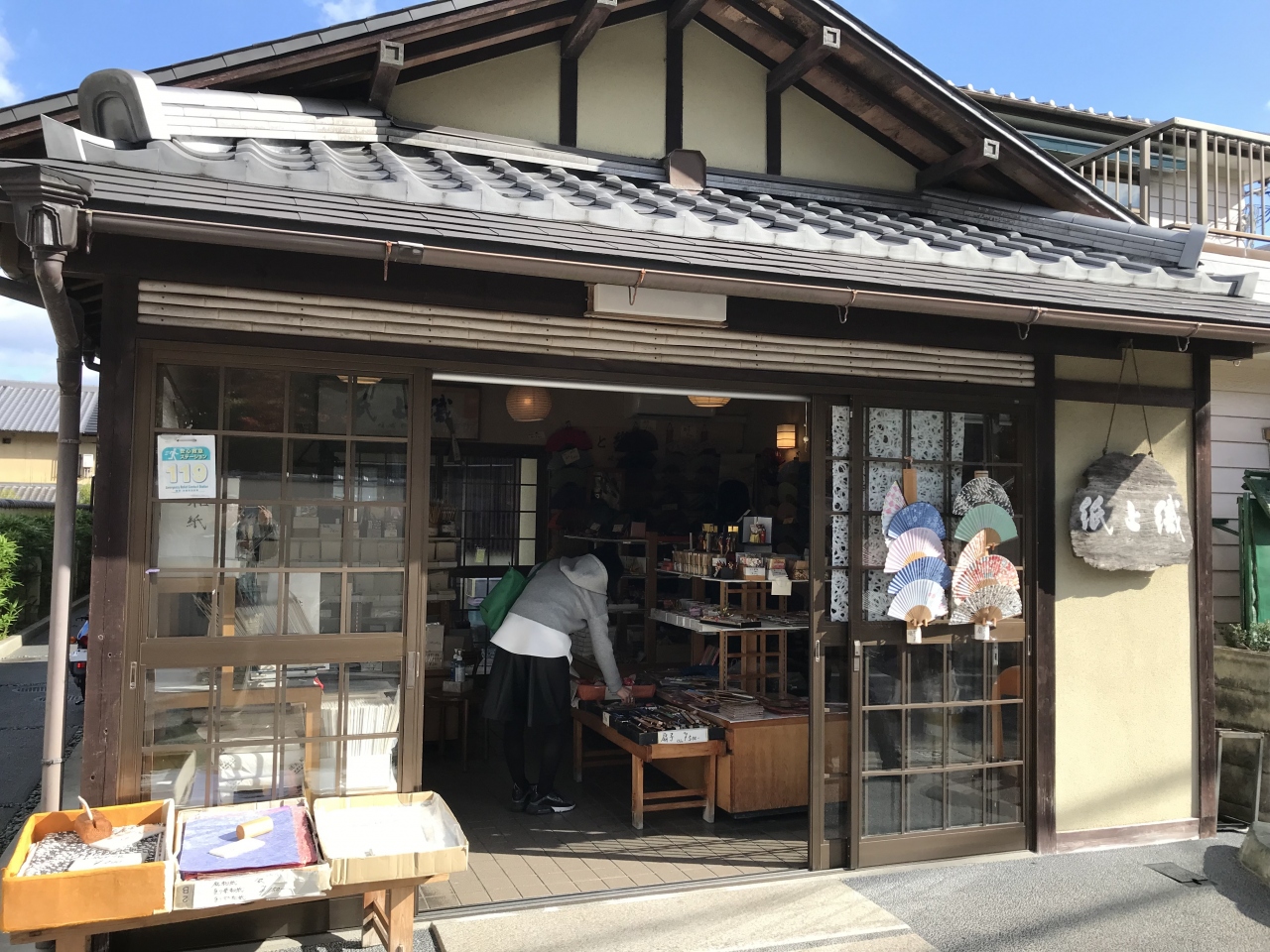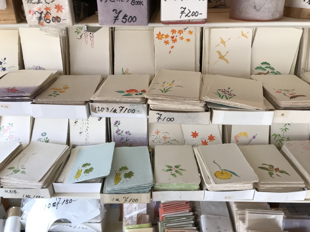 紙と織 嵯峨野工房は、二尊院から化野念仏寺方面に少しいった道沿いにある和紙の専門店です。和紙そのものや和紙でできた製品を販売されています。和紙で作られたなんとも京都らしい葉書きをお土産に購入しました。葉書きは、1つひとつが手摺りの手描き、手づくりなので色の濃淡やデザインも少しづつ異なり、どれも1点ものといった感じです。